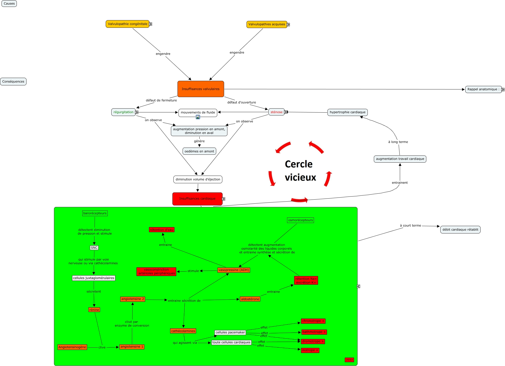 Cette carte de concepts créée avec IHMC CmapTools traite de: Insuffisance valvulaire 3.0, SNC qui stimule par voie nerveuse ou via cathécolamines cellules juxtaglomérulaires, Insuffisances valvulaires défaut de fermeture régurgitation, Valvulopathies acquises infection bactérienne (endocardite), besoins physiologiques consommation électrolytes, Causes intrinsèques soit alimentation, Valve Tricupside Ventricule droit, rétention Na+ excrétion K+ détectent augmentation osmolarité des liquides corporels et entraine synthèse et sécrétion de vasopressine (ADH), diminution volume d'éjection Insuffisances cardiaque, cathécolamines qui agissent via cellules pacemaker, Ventricule Gauche Valve Aortique, Insuffisances valvulaires défaut d'ouverture sténose, sténose on observe diminution volume d'éjection, rhumatisme articulaire aigu causé par infection des voies respiratoires, augmentation pression OG augmentation pression pulmonaire, régurgitation on observe augmentation pression en amont, diminution en aval, Base fibreuse qui sépare la masse atriale de la masse ventriculaire contitué de : Ont pour rôle de permettre le bon fonctionnement des valves cardiaques grace à leur rigidité relative, régurgitation mouvements de fluide, Strucutre du coeur Septum cardiaque, Petite circulation Oreillette Gauche, augmentation pression OG augmentation pression pulmonaire