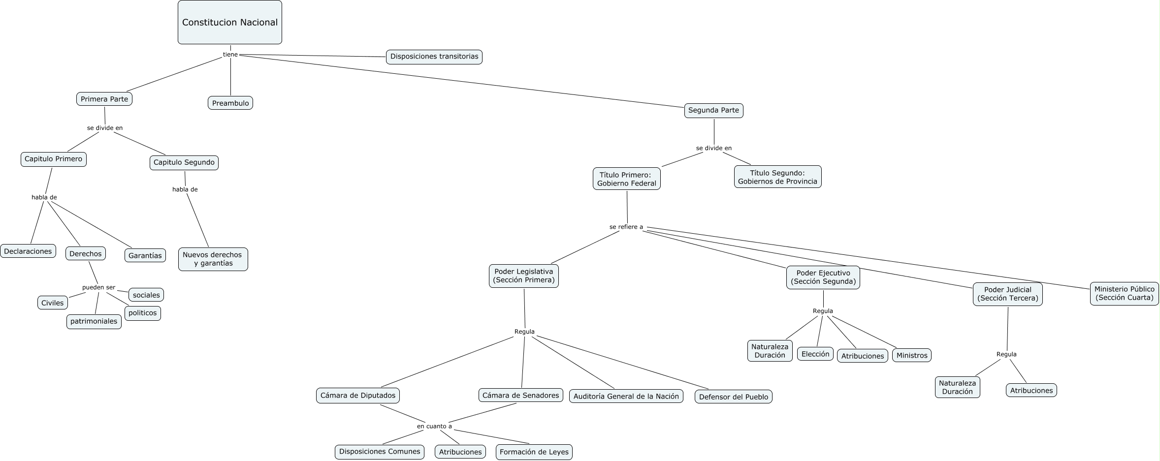 Este Cmap, tiene información relacionada con: Estructura Interna Constitución Nacional, Primera Parte se divide en Capitulo Primero, Poder Ejecutivo (Sección Segunda) Regula Elección, Cámara de Diputados en cuanto a Disposiciones Comunes, Poder Ejecutivo (Sección Segunda) Regula Naturaleza Duración, Ministerio Público (Sección Cuarta) se refiere a Poder Ejecutivo (Sección Segunda), Derechos pueden ser sociales, Segunda Parte se divide en Título Segundo: Gobiernos de Provincia, Poder Judicial (Sección Tercera) Regula Naturaleza Duración, Cámara de Diputados en cuanto a Cámara de Senadores, Título Primero: Gobierno Federal se refiere a Poder Ejecutivo (Sección Segunda), Derechos pueden ser patrimoniales, Constitucion Nacional tiene Preambulo, Capitulo Primero habla de Derechos, Título Primero: Gobierno Federal se refiere a Poder Legislativa (Sección Primera), Derechos pueden ser Civiles, Ministerio Público (Sección Cuarta) se refiere a Poder Judicial (Sección Tercera), Capitulo Primero habla de Declaraciones, Poder Legislativa (Sección Primera) Regula Auditoría General de la Nación, Título Primero: Gobierno Federal se refiere a Poder Judicial (Sección Tercera), Cámara de Diputados en cuanto a Formación de Leyes