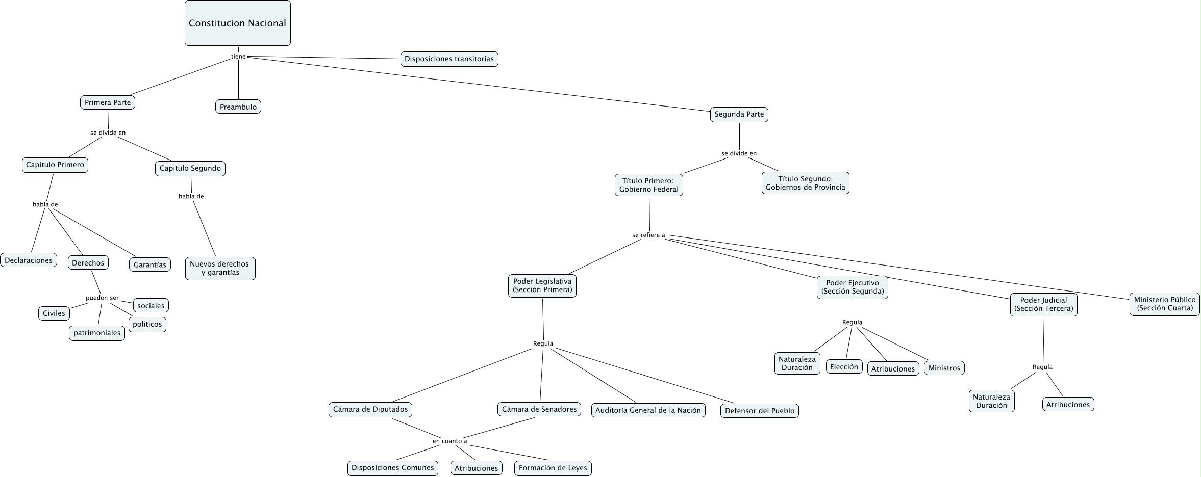 Este Cmap, tiene información relacionada con: Estructura Interna Constitución Nacional, Primera Parte se divide en Capitulo Primero, Poder Ejecutivo (Sección Segunda) Regula Elección, Cámara de Diputados en cuanto a Disposiciones Comunes, Segunda Parte se divide en Título Segundo: Gobiernos de Provincia, Derechos pueden ser sociales, Ministerio Público (Sección Cuarta) se refiere a Poder Ejecutivo (Sección Segunda), Poder Ejecutivo (Sección Segunda) Regula Naturaleza Duración, Poder Judicial (Sección Tercera) Regula Naturaleza Duración, Cámara de Diputados en cuanto a Cámara de Senadores, Título Primero: Gobierno Federal se refiere a Poder Ejecutivo (Sección Segunda), Derechos pueden ser patrimoniales, Título Primero: Gobierno Federal se refiere a Poder Legislativa (Sección Primera), Capitulo Primero habla de Derechos, Constitucion Nacional tiene Preambulo, Derechos pueden ser Civiles, Ministerio Público (Sección Cuarta) se refiere a Poder Judicial (Sección Tercera), Capitulo Primero habla de Declaraciones, Poder Legislativa (Sección Primera) Regula Auditoría General de la Nación, Título Primero: Gobierno Federal se refiere a Poder Judicial (Sección Tercera), Constitucion Nacional tiene Primera Parte