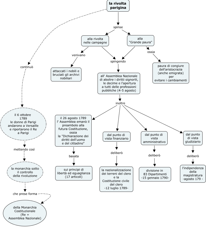Questa Cmap, creata con IHMC CmapTools, contiene informazioni relative a: La rivolta parigina e lì Assemblea nazionale, all' Assemblea Nazionale di abolire i diritti signorili, le decime e l'apertura a tutti delle professioni pubbliche (4-5 agosto) inoltre dal punto di vista amministrativo, alla "Grande paura" spingendo all' Assemblea Nazionale di abolire i diritti signorili, le decime e l'apertura a tutti delle professioni pubbliche (4-5 agosto), alla rivolta nelle campagne spingendo all' Assemblea Nazionale di abolire i diritti signorili, le decime e l'apertura a tutti delle professioni pubbliche (4-5 agosto), dal punto di vista amministrativo deliberò divisione in 83 Dipartimenti -15 gennaio 1790-, dal punto di vista finanziario deliberò la nazionalizzazione dei terreni del clero e la Costituzione civile del clero -12 luglio 1789-, la rivolta parigina spinse alla rivolta nelle campagne, all' Assemblea Nazionale di abolire i diritti signorili, le decime e l'apertura a tutti delle professioni pubbliche (4-5 agosto) inoltre dal punto di vista giudiziario, dal punto di vista giudiziario deliberò l'indipendenza della magistratura -agosto 179 -, la monarchia sotto il controllo della rivoluzione che prese forma della Monarchia Costituzionale (Re + Assemblea Nazionale), la rivolta parigina spinse alla "Grande paura", alla rivolta nelle campagne venivano attaccati i nobili e bruciati gli archivi nobiliari, alla "Grande paura" ossia paura di congiure dell'aristocrazia (anche emigrata) per evitare i cambiamenti, all' Assemblea Nazionale di abolire i diritti signorili, le decime e l'apertura a tutti delle professioni pubbliche (4-5 agosto) inoltre dal punto di vista finanziario, la rivolta parigina continuò il 6 ottobre 1789 le donne di Parigi andarono a Versaille e riportarono il Re a Parigi, il 6 ottobre 1789 le donne di Parigi andarono a Versaille e riportarono il Re a Parigi mettendo così la monarchia sotto il controllo della rivoluzione, il 26 agosto 1789 l' Assemblea emanò il preambolo alla futura Costituzione, ossia la "Dichiarazione dei diritti dell'uomo e del cittadino" basata sui principi di libertà ed eguaglianza (17 articoli), all' Assemblea Nazionale di abolire i diritti signorili, le decime e l'apertura a tutti delle professioni pubbliche (4-5 agosto) inoltre il 26 agosto 1789 l' Assemblea emanò il preambolo alla futura Costituzione, ossia la "Dichiarazione dei diritti dell'uomo e del cittadino"