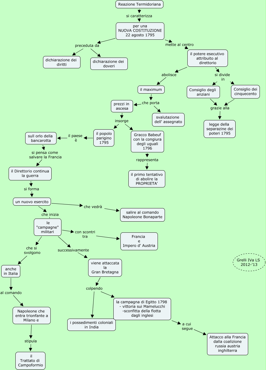 Questa Cmap, creata con IHMC CmapTools, contiene informazioni relative a: reazione termidoriana grelli 4als, viene attaccata la Gran Bretagna colpendo la campagna di Egitto 1798 - vittoria sui Mamelucchi -sconfitta della flotta dagli inglesi, la campagna di Egitto 1798 - vittoria sui Mamelucchi -sconfitta della flotta dagli inglesi a cui segue Attacco alla Francia dalla coalizione russia austria inghilterra, le "campagne" militari con scontri tra Francia e Impero d' Austria, il maximum che porta prezzi in ascesa, il Direttorio continua la guerra si forma un nuovo esercito, per una NUOVA COSTITUZIONE 22 agosto 1795 preceduta da dichiarazione dei doveri, il potere esecutivo attribuito al direttorio abolisce il maximum, prezzi in ascesa insorge Gracco Babeuf con la congiura degli uguali 1796, Consiglio dei cinquecento grazie alla legge della separazine dei poteri 1795, un nuovo esercito che inizia le "campagne" militari, le "campagne" militari che si svolgono anche in Italia, Reazione Termidoriana si caratterizza per una NUOVA COSTITUZIONE 22 agosto 1795, viene attaccata la Gran Bretagna colpendo i possedimenti coloniali in India, per una NUOVA COSTITUZIONE 22 agosto 1795 preceduta da dichiarazione dei diritti, il maximum che porta svalutazione dell' assegnato, per una NUOVA COSTITUZIONE 22 agosto 1795 mette al centro il potere esecutivo attribuito al direttorio, Consiglio degli anziani grazie alla legge della separazine dei poteri 1795, sull orlo della bancarotta si pensa come salvare la Francia il Direttorio continua la guerra, anche in Italia al comando Napoleone che entra trionfante a Milano e, prezzi in ascesa insorge il popolo parigino 1795