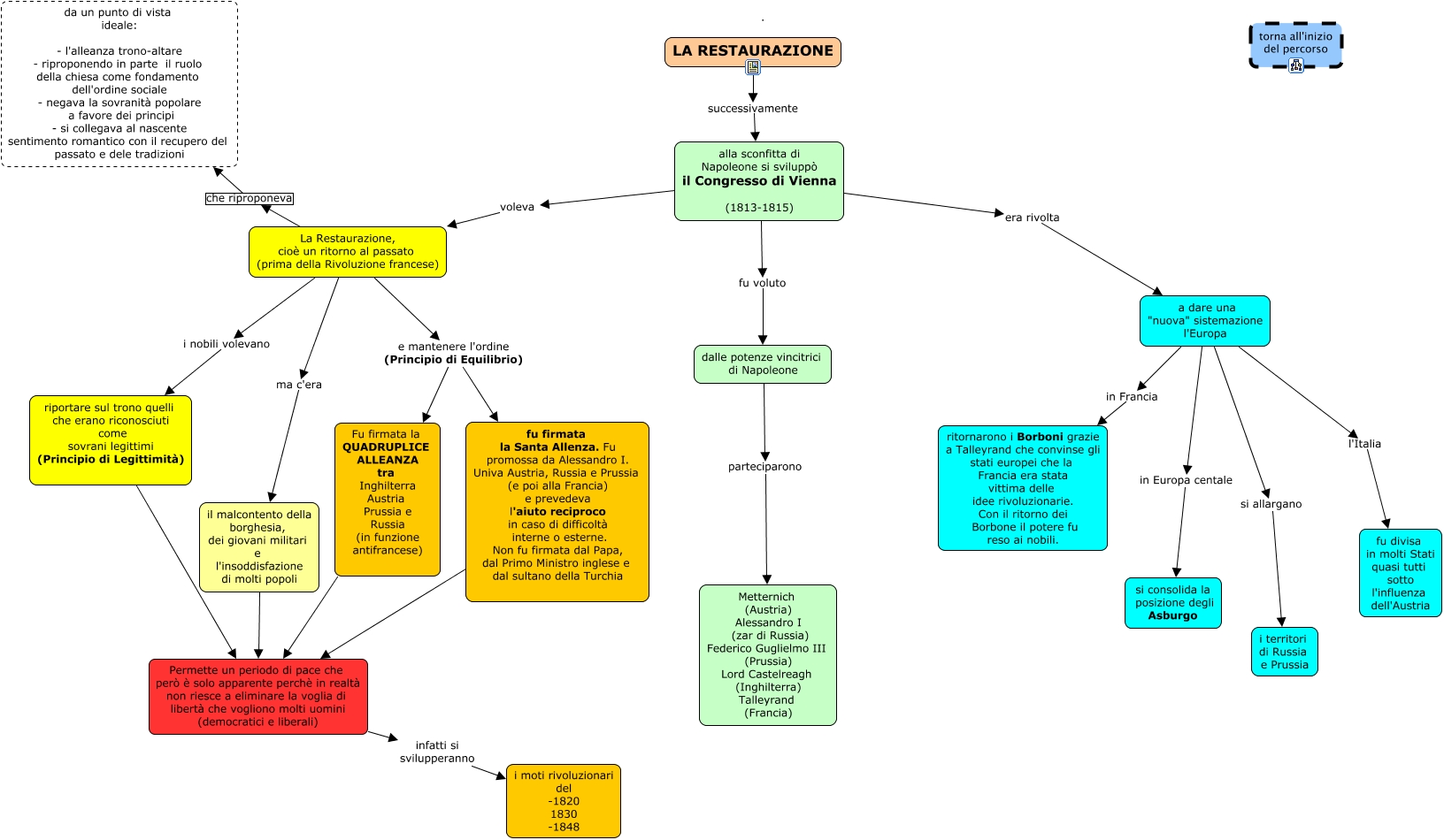 Questa Cmap, creata con IHMC CmapTools, contiene informazioni relative a: La Restaurazione, La Restaurazione, cioè un ritorno al passato (prima della Rivoluzione francese) e mantenere l'ordine (Principio di Equilibrio) Fu firmata la QUADRUPLICE ALLEANZA tra Inghilterra Austria Prussia e Russia (in funzione antifrancese), dalle potenze vincitrici di Napoleone parteciparono Metternich (Austria) Alessandro I (zar di Russia) Federico Guglielmo III (Prussia) Lord Castelreagh (Inghilterra) Talleyrand (Francia), La Restaurazione, cioè un ritorno al passato (prima della Rivoluzione francese) i nobili volevano riportare sul trono quelli che erano riconosciuti come sovrani legittimi (Principio di Legittimità), a dare una "nuova" sistemazione l'Europa si allargano i territori di Russia e Prussia, alla sconfitta di Napoleone si sviluppò il Congresso di Vienna (1813-1815) era rivolta a dare una "nuova" sistemazione l'Europa, a dare una "nuova" sistemazione l'Europa in Francia ritornarono i Borboni grazie a Talleyrand che convinse gli stati europei che la Francia era stata vittima delle idee rivoluzionarie. Con il ritorno dei Borbone il potere fu reso ai nobili., riportare sul trono quelli che erano riconosciuti come sovrani legittimi (Principio di Legittimità) Permette un periodo di pace che però è solo apparente perchè in realtà non riesce a eliminare la voglia di libertà che vogliono molti uomini (democratici e liberali), La Restaurazione, cioè un ritorno al passato (prima della Rivoluzione francese) e mantenere l'ordine (Principio di Equilibrio) fu firmata la Santa Allenza. Fu promossa da Alessandro I. Univa Austria, Russia e Prussia (e poi alla Francia) e prevedeva l'aiuto reciproco in caso di difficoltà interne o esterne. Non fu firmata dal Papa, dal Primo Ministro inglese e dal sultano della Turchia, Permette un periodo di pace che però è solo apparente perchè in realtà non riesce a eliminare la voglia di libertà che vogliono molti uomini (democratici e liberali) infatti si svilupperanno i moti rivoluzionari del -1820 1830 -1848, alla sconfitta di Napoleone si sviluppò il Congresso di Vienna (1813-1815) fu voluto dalle potenze vincitrici di Napoleone, La Restaurazione, cioè un ritorno al passato (prima della Rivoluzione francese) che riproponeva da un punto di vista ideale: - l'alleanza trono-altare - riproponendo in parte il ruolo della chiesa come fondamento dell'ordine sociale - negava la sovranità popolare a favore dei principi - si collegava al nascente sentimento romantico con il recupero del passato e dele tradizioni, a dare una "nuova" sistemazione l'Europa in Europa centale si consolida la posizione degli Asburgo, alla sconfitta di Napoleone si sviluppò il Congresso di Vienna (1813-1815) voleva La Restaurazione, cioè un ritorno al passato (prima della Rivoluzione francese), LA RESTAURAZIONE successivamente alla sconfitta di Napoleone si sviluppò il Congresso di Vienna (1813-1815), Fu firmata la QUADRUPLICE ALLEANZA tra Inghilterra Austria Prussia e Russia (in funzione antifrancese) Permette un periodo di pace che però è solo apparente perchè in realtà non riesce a eliminare la voglia di libertà che vogliono molti uomini (democratici e liberali), il malcontento della borghesia, dei giovani militari e l'insoddisfazione di molti popoli Permette un periodo di pace che però è solo apparente perchè in realtà non riesce a eliminare la voglia di libertà che vogliono molti uomini (democratici e liberali), La Restaurazione, cioè un ritorno al passato (prima della Rivoluzione francese) ma c'era il malcontento della borghesia, dei giovani militari e l'insoddisfazione di molti popoli, fu firmata la Santa Allenza. Fu promossa da Alessandro I. Univa Austria, Russia e Prussia (e poi alla Francia) e prevedeva l'aiuto reciproco in caso di difficoltà interne o esterne. Non fu firmata dal Papa, dal Primo Ministro inglese e dal sultano della Turchia Permette un periodo di pace che però è solo apparente perchè in realtà non riesce a eliminare la voglia di libertà che vogliono molti uomini (democratici e liberali), a dare una "nuova" sistemazione l'Europa l'Italia fu divisa in molti Stati quasi tutti sotto l'influenza dell'Austria