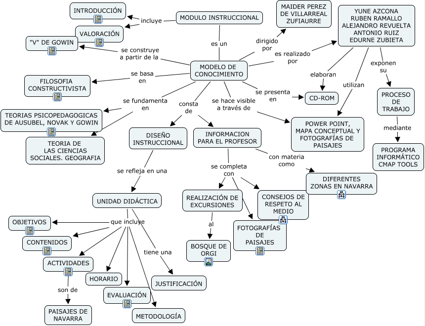Este Cmap, tiene información relacionada con: MAPACONCEPTUAL PAISAJES, MODELO DE CONOCIMIENTO dirigido por MAIDER PEREZ DE VILLARREAL ZUFIAURRE, MODELO DE CONOCIMIENTO se basa en FILOSOFIA CONSTRUCTIVISTA, YUNE AZCONA RUBEN RAMALLO ALEJANDRO REVUELTA ANTONIO RUIZ EDURNE ZUBIETA utilizan POWER POINT, MAPA CONCEPTUAL Y FOTOGRAFÍAS DE PAISAJES, UNIDAD DIDÁCTICA que incluye METODOLOGÍA, YUNE AZCONA RUBEN RAMALLO ALEJANDRO REVUELTA ANTONIO RUIZ EDURNE ZUBIETA exponen su PROCESO DE TRABAJO, ACTIVIDADES son de PAISAJES DE NAVARRA, MODELO DE CONOCIMIENTO se construye a partir de la "V" DE GOWIN, MODELO DE CONOCIMIENTO se presenta en CD-ROM, UNIDAD DIDÁCTICA que incluye OBJETIVOS, UNIDAD DIDÁCTICA tiene una JUSTIFICACIÓN, MODELO DE CONOCIMIENTO se fundamenta en TEORIAS PSICOPEDAGOGICAS DE AUSUBEL, NOVAK Y GOWIN, UNIDAD DIDÁCTICA que incluye HORARIO, INFORMACION PARA EL PROFESOR se completa con REALIZACIÓN DE EXCURSIONES, INFORMACION PARA EL PROFESOR con materia como DIFERENTES ZONAS EN NAVARRA, INFORMACION PARA EL PROFESOR se completa con FOTOGRAFÍAS DE PAISAJES, DISEÑO INSTRUCCIONAL se refleja en una UNIDAD DIDÁCTICA, MODELO DE CONOCIMIENTO se hace visible a través de POWER POINT, MAPA CONCEPTUAL Y FOTOGRAFÍAS DE PAISAJES, UNIDAD DIDÁCTICA que incluye EVALUACIÓN, MODULO INSTRUCCIONAL incluye VALORACIÓN, MODULO INSTRUCCIONAL incluye INTRODUCCIÓN