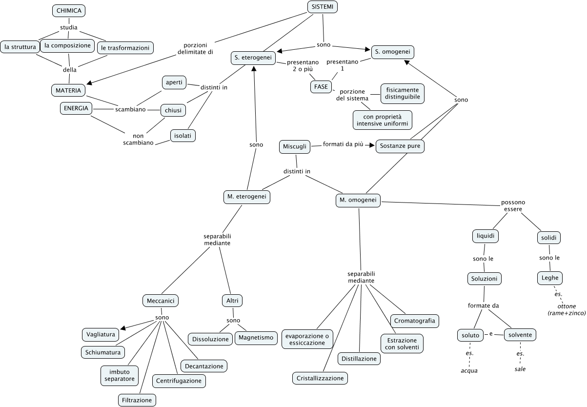 Questa Cmap, creata con IHMC CmapTools, contiene informazioni relative a: Sistemi, Meccanici sono Decantazione, aperti scambiano ENERGIA, la struttura della MATERIA, aperti scambiano MATERIA, Soluzioni formate da soluto, FASE porzione del sistema fisicamente distinguibile, M. omogenei possono essere solidi, SISTEMI sono S. eterogenei, chiusi scambiano ENERGIA, solvente es. sale, M. omogenei separabili mediante Estrazione con solventi, soluto e solvente, Miscugli formati da più Sostanze pure, SISTEMI sono S. omogenei, Miscugli distinti in M. omogenei, liquidi sono le Soluzioni, Leghe es. ottone (rame+zinco), Meccanici sono Filtrazione, Soluzioni formate da solvente, M. eterogenei separabili mediante Meccanici