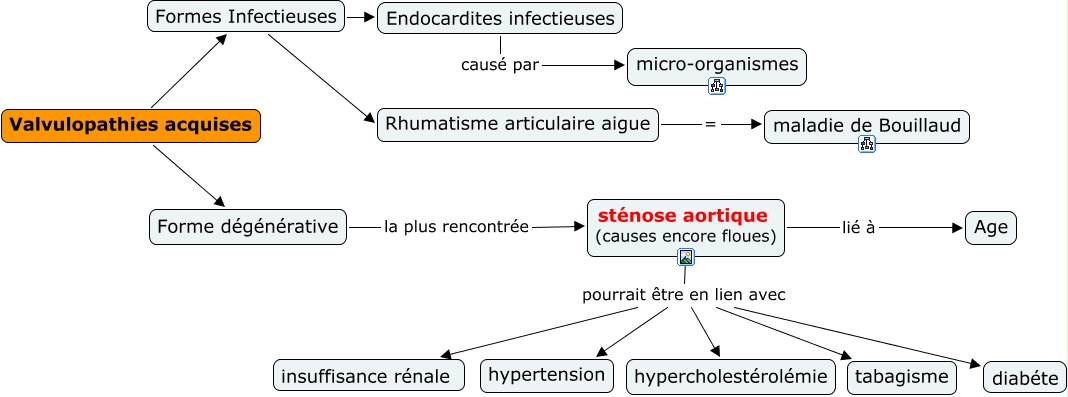 Cette carte de concepts créée avec IHMC CmapTools traite de: causes acquises, sténose aortique (causes encore floues) pourrait être en lien avec hypercholestérolémie, Rhumatisme articulaire aigue = maladie de Bouillaud, sténose aortique (causes encore floues) pourrait être en lien avec diabéte, Endocardites infectieuses causé par micro-organismes, Formes Infectieuses Rhumatisme articulaire aigue, Forme dégénérative la plus rencontrée sténose aortique (causes encore floues), Formes Infectieuses Endocardites infectieuses, sténose aortique (causes encore floues) pourrait être en lien avec tabagisme, Valvulopathies acquises Forme dégénérative, sténose aortique (causes encore floues) lié à Age, sténose aortique (causes encore floues) pourrait être en lien avec insuffisance rénale, Valvulopathies acquises Formes Infectieuses, sténose aortique (causes encore floues) pourrait être en lien avec hypertension