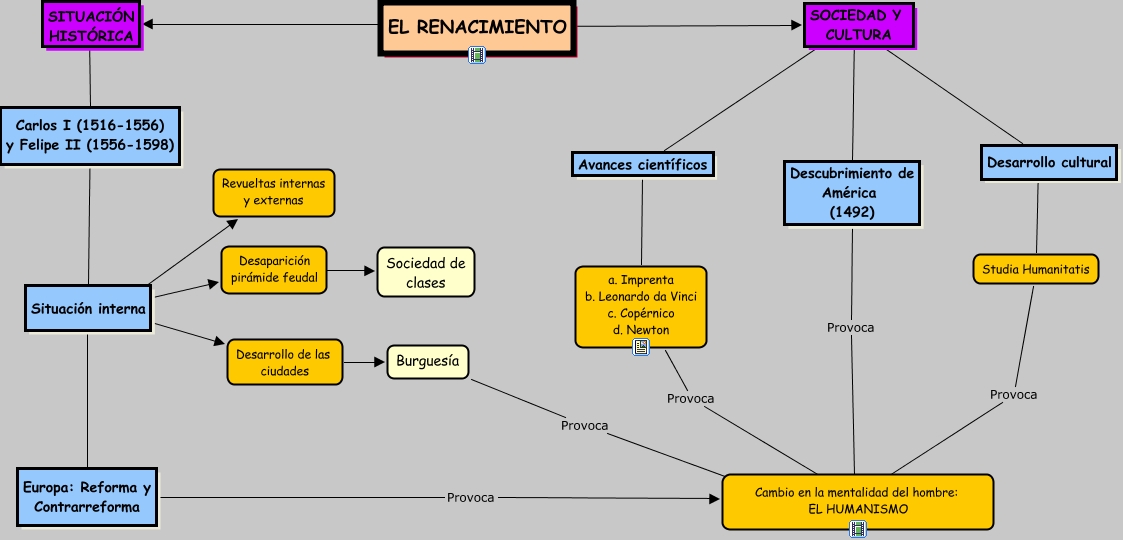Este Cmap, tiene información relacionada con: EL RENACIMIENTO, SOCIEDAD Y CULTURA ???? Descubrimiento de América (1492), Descubrimiento de América (1492) Provoca Cambio en la mentalidad del hombre: EL HUMANISMO, Desarrollo cultural ???? Studia Humanitatis, Situación interna ???? Desaparición pirámide feudal, EL RENACIMIENTO ???? SOCIEDAD Y CULTURA, SOCIEDAD Y CULTURA ???? Avances científicos, EL RENACIMIENTO ???? SITUACIÓN HISTÓRICA, Situación interna ???? Europa: Reforma y Contrarreforma, Carlos I (1516-1556) y Felipe II (1556-1598) ???? Situación interna, Situación interna ???? Desarrollo de las ciudades, a. Imprenta b. Leonardo da Vinci c. Copérnico d. Newton Provoca Cambio en la mentalidad del hombre: EL HUMANISMO, Situación interna ???? Revueltas internas y externas, Studia Humanitatis Provoca Cambio en la mentalidad del hombre: EL HUMANISMO, SOCIEDAD Y CULTURA ???? Desarrollo cultural, a. Imprenta b. Leonardo da Vinci c. Copérnico d. Newton ???? Avances científicos, Desaparición pirámide feudal ???? Sociedad de clases, SITUACIÓN HISTÓRICA ???? Carlos I (1516-1556) y Felipe II (1556-1598), Desarrollo de las ciudades ???? Burguesía, Burguesía Provoca Cambio en la mentalidad del hombre: EL HUMANISMO, Europa: Reforma y Contrarreforma Provoca Cambio en la mentalidad del hombre: EL HUMANISMO