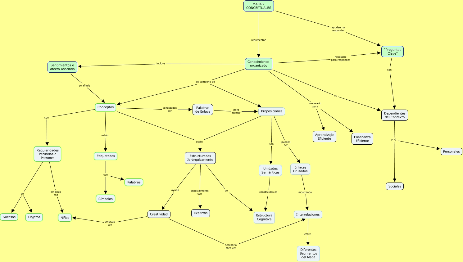 Este Cmap, tiene información relacionada con: Mapa conc Ysabel, Proposiciones son Unidades Semánticas, Conocimiento organizado necesario para Enseñanza Eficiente, Enlaces Cruzados mostrando Interrelaciones, "Preguntas Clave" son Dependientes del Contexto, Conceptos están Estructuradas Jerárquicamente, Etiquetados con Símbolos, Regularidades Pecibidas o Patrones en Objetos, Conocimiento organizado necesario para responder "Preguntas Clave", Conocimiento organizado incluye Sentimientos o Afecto Asociado, Regularidades Pecibidas o Patrones empieza con Niños, Proposiciones pueden ser Enlaces Cruzados, Estructuradas Jerárquicamente en Estructura Cognitiva, Proposiciones están Estructuradas Jerárquicamente, MAPAS CONCEPTUALES ayudan na responder "Preguntas Clave", Creatividad empieza con Niños, Conocimiento organizado se compone de Proposiciones, Conceptos son Regularidades Pecibidas o Patrones, Interrelaciones entre Diferentes Segmentos del Mapa, Dependientes del Contexto p.ej. Sociales, Estructuradas Jerárquicamente ayuda Creatividad