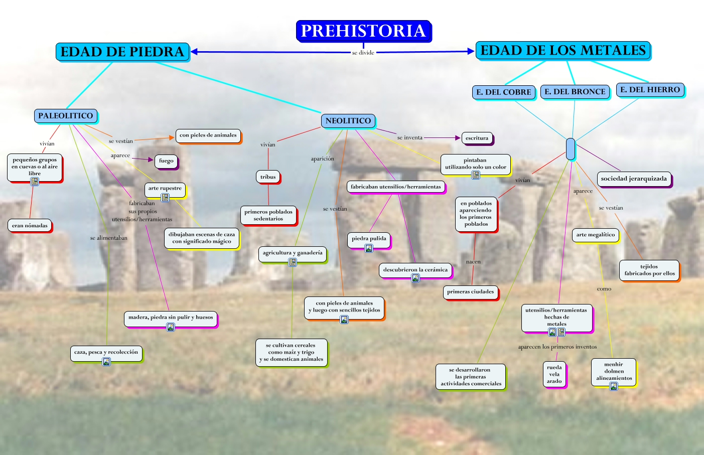 Este Cmap, tiene información relacionada con: mapa prehistoria, E. DEL HIERRO sociedad jerarquizada, NEOLITICO aparición agricultura y ganadería, PALEOLITICO aparece arte rupestre, se vestían tejidos fabricados por ellos, fabricaban utensilios/herramientas piedra pulida, PALEOLITICO aparece fuego, EDAD DE LOS METALES E. DEL BRONCE, NEOLITICO vivían tríbus, en poblados apareciendo los primeros poblados nacen primeras ciudades, E. DEL HIERRO se desarrollaron las primeras actividades comerciales, NEOLITICO pintaban utilizando solo un color, EDAD DE LOS METALES E. DEL COBRE, utensilios/herramientas hechas de metales aparecen los primeros inventos rueda vela arado, E. DEL COBRE sociedad jerarquizada, NEOLITICO fabricaban utensilios/herramientas, E. DEL BRONCE utensilios/herramientas hechas de metales, PREHISTORIA se divide EDAD DE PIEDRA, PALEOLITICO fabricaban sus propios utensilios/herramientas madera, piedra sin pulir y huesos, pequeños grupos en cuevas o al aire libre eran nómadas, EDAD DE LOS METALES E. DEL HIERRO