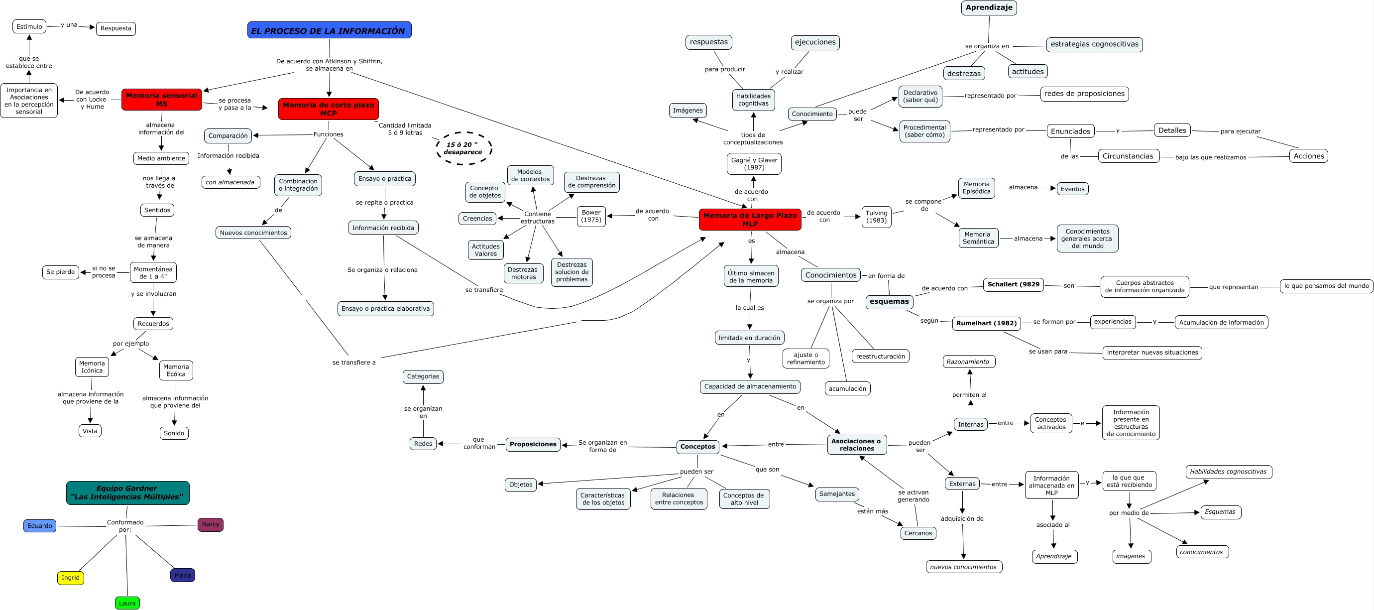 Este Cmap, tiene información relacionada con: el proceso de la informacion, Información recibida se transfiere, Memoria Icónica almacena información que proviene de la Vista, Memoria de corto plazo MCP Funciones Comparación, Memoria de corto plazo MCP Funciones Ensayo o práctica, la que que está recibiendo por medio de Esquemas, Medio ambiente nos llega a través de, esquemas de acuerdo con Schallert (9829, EL PROCESO DE LA INFORMACIÓN De acuerdo con Atkinson y Shiffrin, se almacena en Memoria de corto plazo MCP, Conocimientos se organiza por reestructuración, Momentánea de 1 a 4" y se involucran Recuerdos, Conceptos Se organizan en forma de Proposiciones, Gagné y Glaser (1987) tipos de conceptualizaciones Imágenes, Gagné y Glaser (1987) tipos de conceptualizaciones Habilidades cognitivas, Nuevos conocimientos se transfiere a, Conocimiento puede ser Procedimental (saber cómo), Conceptos activados e Información presente en estructuras de conocimiento, Aprendizaje se organiza en estrategias cognoscitivas, Rumelhart (1982) se usan para interpretar nuevas situaciones, Externas adquisición de nuevos conocimientos, Memoria de Largo Plazo MLP de acuerdo con Gagné y Glaser (1987)