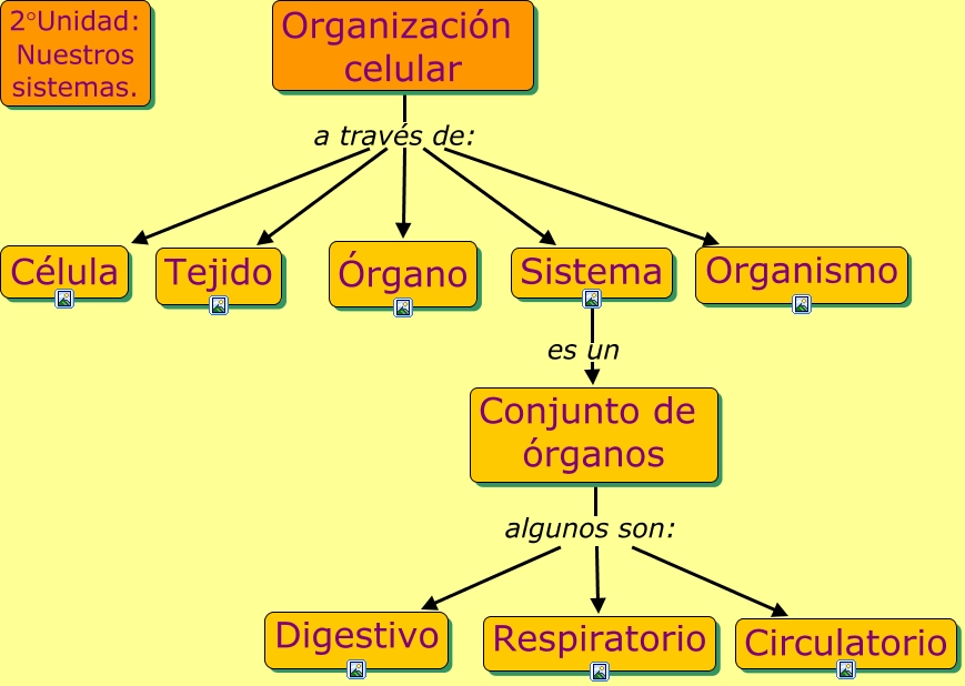 Este Cmap, tiene información relacionada con: organizacion celular, Organización celular a través de: Órgano, Conjunto de órganos algunos son: Respiratorio, Organización celular a través de: Sistema, Organización celular a través de: Célula, Conjunto de órganos algunos son: Circulatorio, Conjunto de órganos algunos son: Digestivo, Sistema es un Conjunto de órganos, Organización celular a través de: Organismo, Organización celular a través de: Tejido