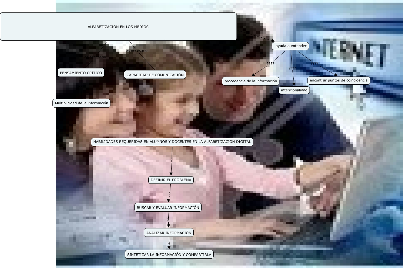 Este Cmap, tiene información relacionada con: ALFABETIZACIÓN DIGITAL, PENSAMIENTO CRÍTICO por Multiplicidad de la información, ayuda a entender ???? procedencia de la información, ayuda a entender ???? intencionalidad, DEFINIR EL PROBLEMA 2 BUSCAR Y EVALUAR INFORMACIÓN, HABILIDADES REQUERIDAS EN ALUMNOS Y DOCENTES EN LA ALFABETIZACION DIGITAL 1 DEFINIR EL PROBLEMA, BUSCAR Y EVALUAR INFORMACIÓN 3 ANALIZAR INFORMACIÓN, ANALIZAR INFORMACIÓN 4 SINTETIZAR LA INFORMACIÓN Y COMPARTIRLA, ALFABETIZACIÓN EN LOS MEDIOS es necesario PENSAMIENTO CRÍTICO, ALFABETIZACIÓN EN LOS MEDIOS es necesario CAPACIDAD DE COMUNICACIÓN, ayuda a entender ???? encontrar puntos de coincidencia, ALFABETIZACIÓN EN LOS MEDIOS ayu ayuda a entender