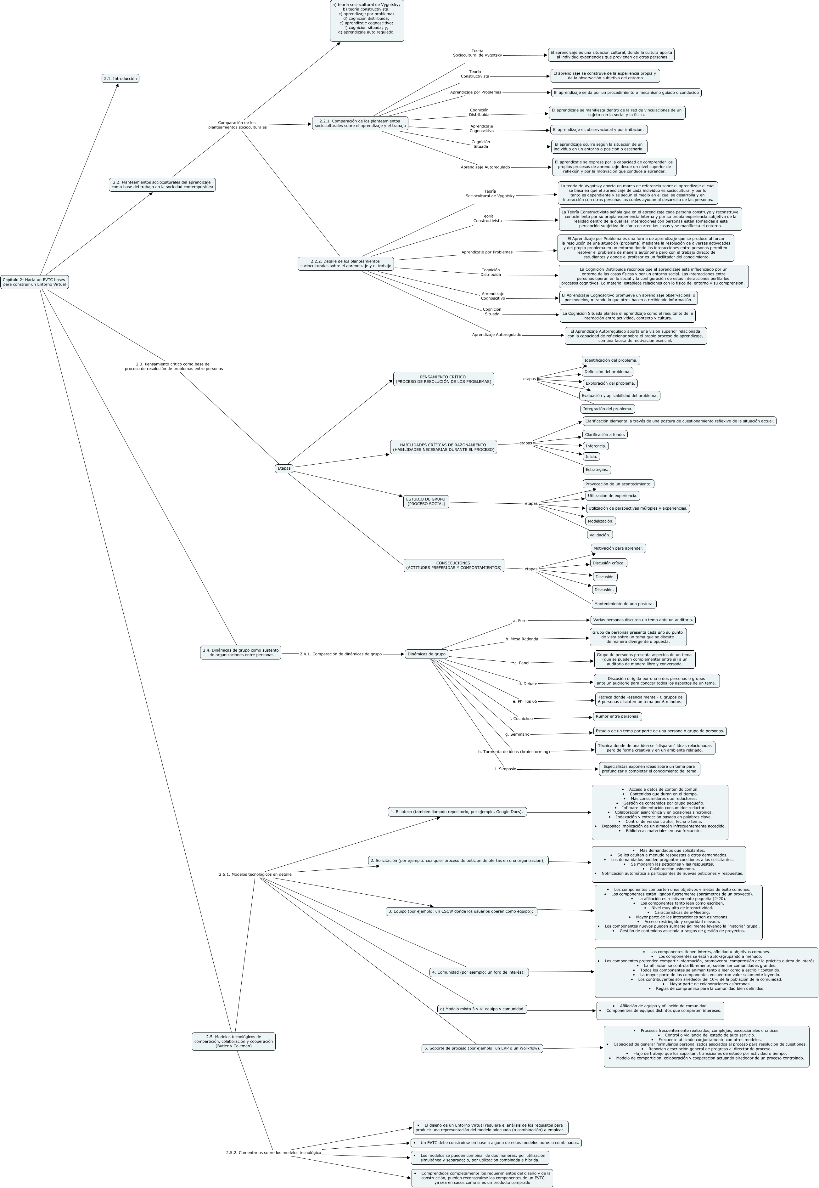 Este Cmap, tiene información relacionada con: 7.2 Hacia un EVTC bases para construir un Entorno Virtual, 2.2.1. Comparación de los planteamientos socioculturales sobre el aprendizaje y el trabajo Aprendizaje Autoregulado El aprendizaje se expresa por la capacidad de comprender los propios procesos de aprendizaje desde un nivel superior de reflexión y por la motivación que conduce a aprender., ESTUDIO DE GRUPO (PROCESO SOCIAL) etapas Validación., HABILIDADES CRÍTICAS DE RAZONAMIENTO (HABILIDADES NECESARIAS DURANTE EL PROCESO) etapas Juicio., 4. Comunidad (por ejemplo: un foro de interés); ???? • Los componentes tienen interés, afinidad u objetivos comunes. • Los componentes se están auto-agrupando a menudo. • Los componentes pretenden compartir información, promover su comprensión de la práctica o área de interés. • La afiliación se controla libremente, suelen ser comunidades grandes. • Todos los componentes se animan tanto a leer como a escribir contenido. • La mayor parte de los componentes encuentran valor solamente leyendo. • Los contribuyentes son alrededor del 10% de la población de la comunidad. • Mayor parte de colaboraciones asíncronas. • Reglas de compromiso para la comunidad bien definidos., CONSECUCIONES (ACTITUDES PREFERIDAS Y COMPORTAMIENTOS) etapas Discusión., 5. Soporte de proceso (por ejemplo: un ERP o un Workflow). ???? • Procesos frecuentemente realizados, complejos, excepcionales o críticos. • Control o vigilancia del estado de auto servicio. • Frecuente utilizado conjuntamente con otros modelos. • Capacidad de generar formularios personalizados asociados al proceso para resolución de cuestiones. • Reportan descripción general de progreso al director de proceso. • Flujo de trabajo que los soportan, transiciones de estado por actividad o tiempo. • Modelo de compartición, colaboración y cooperación actuando alrededor de un proceso controlado., 2.2.1. Comparación de los planteamientos socioculturales sobre el aprendizaje y el trabajo Cognición Situada El aprendizaje ocurre según la situación de un individuo en un entorno o posición o escenario., 3. Equipo (por ejemplo: un CSCW donde los usuarios operan como equipo); ???? • Los componentes comparten unos objetivos y metas de éxito comunes. • Los componentes están ligados fuertemente (parámetros de un proyecto). • La afiliación es relativamente pequeña (2-20). • Los componentes tanto leen como escriben. • Nivel muy alto de interactividad. • Características de e-Meeting. • Mayor parte de las interacciones son asíncronas. • Acceso restringido y seguridad elevada. • Los componentes nuevos pueden sumarse ágilmente leyendo la "historia" grupal. • Gestión de contenidos asociada a rasgos de gestión de proyectos., Dinámicas de grupo g. Seminario Estudio de un tema por parte de una persona o grupo de personas., ESTUDIO DE GRUPO (PROCESO SOCIAL) etapas Modelización., HABILIDADES CRÍTICAS DE RAZONAMIENTO (HABILIDADES NECESARIAS DURANTE EL PROCESO) etapas Estrategias., 2.5. Modelos tecnológicos de compartición, colaboración y cooperación (Butler y Coleman) 2.5.1. Modelos tecnológicos en detalle 3. Equipo (por ejemplo: un CSCW donde los usuarios operan como equipo);, 2.2. Planteamientos socioculturales del aprendizaje como base del trabajo en la sociedad contemporánea Comparación de los planteamientos socioculturales a) teoría sociocultural de Vygotsky; b) teoría constructivista; c) aprendizaje por problema; d) cognición distribuida; e) aprendizaje cognoscitivo; f) cognición situada; y, g) aprendizaje auto regulado., 2.2.2. Detalle de los planteamientos socioculturales sobre el aprendizaje y el trabajo Teoría Constructivista La Teoría Constructivista señala que en el aprendizaje cada persona construye y reconstruye conocimiento por su propia experiencia interna y por su propia experiencia subjetiva de la realidad dentro de la cual las interacciones con personas están sometidas a esta percepción subjetiva de cómo ocurren las cosas y se manifiesta el entorno., 2.2.2. Detalle de los planteamientos socioculturales sobre el aprendizaje y el trabajo Teoría Sociocultural de Vygotsky La teoría de Vygotsky aporta un marco de referencia sobre el aprendizaje el cual se basa en que el aprendizaje de cada individuo es sociocultural y por lo tanto es dependiente y se según el medio en el cual se desarrolla y en interacción con otras personas las cuales ayudan al desarrollo de las personas., 2.2.2. Detalle de los planteamientos socioculturales sobre el aprendizaje y el trabajo Comparación de los planteamientos socioculturales a) teoría sociocultural de Vygotsky; b) teoría constructivista; c) aprendizaje por problema; d) cognición distribuida; e) aprendizaje cognoscitivo; f) cognición situada; y, g) aprendizaje auto regulado., Capítulo 2- Hacia un EVTC bases para construir un Entorno Virtual 2.3. Pensamiento crítico como base del proceso de resolución de problemas entre personas Etapas, 2.5. Modelos tecnológicos de compartición, colaboración y cooperación (Butler y Coleman) 2.5.2. Comentarios sobre los modelos tecnológico • El diseño de un Entorno Virtual requiere el análisis de los requisitos para producir una representación del modelo adecuado (o combinación) a emplear., 2. Solicitación (por ejemplo: cualquier proceso de petición de ofertas en una organización); ???? • Más demandados que solicitantes. • Se les ocultan a menudo respuestas a otros demandados. • Los demandados pueden preguntar cuestiones a los solicitantes. • Se moderan las peticiones y las respuestas. • Colaboración asíncrona. • Notificación automática a participantes de nuevas peticiones y respuestas., a) Modelo mixto 3 y 4: equipo y comunidad ???? • Afiliación de equipo y afiliación de comunidad. • Componentes de equipos distintos que comparten intereses.
