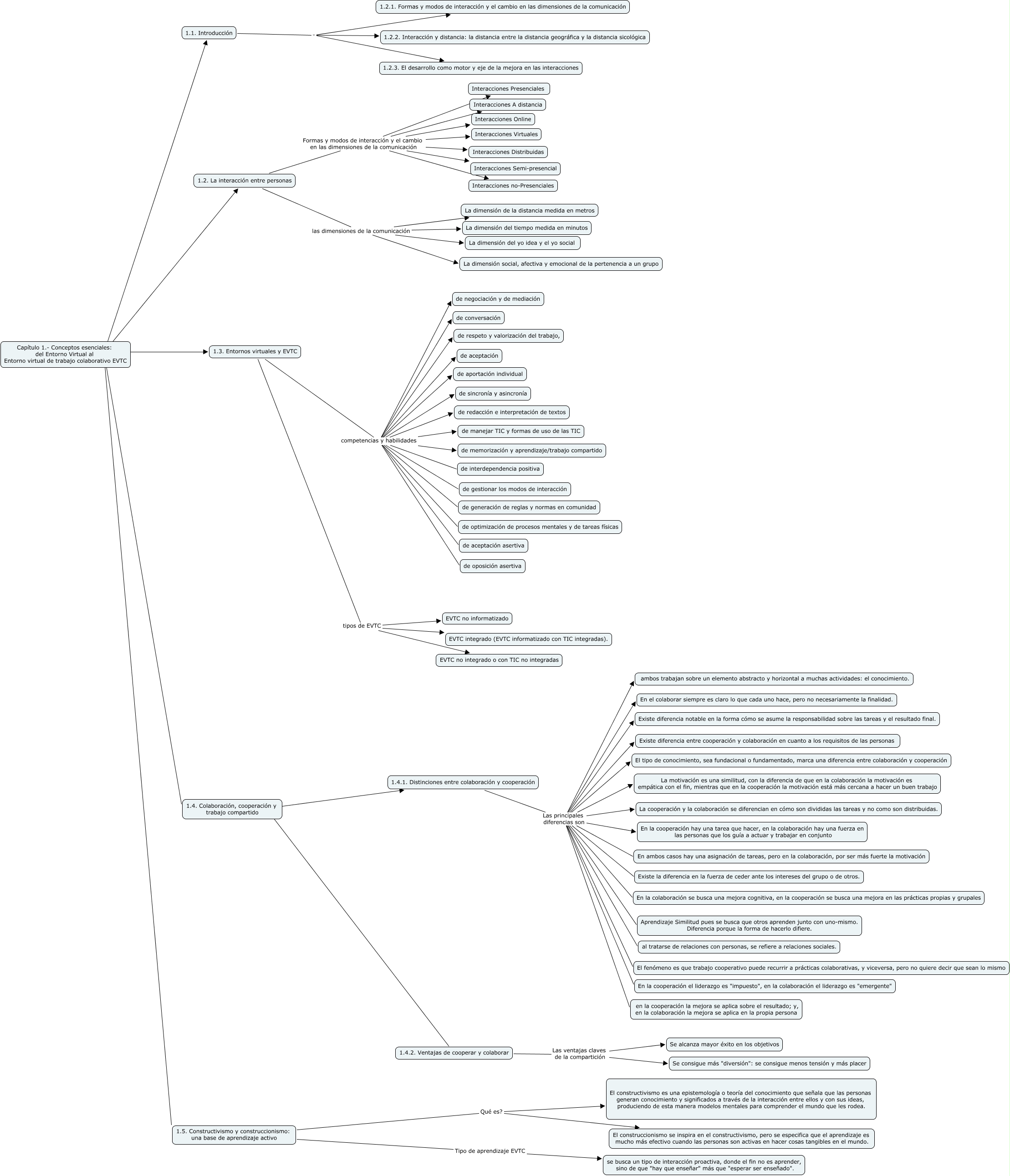 Este Cmap, tiene información relacionada con: 7.1 Conceptos esenciales del Entorno Virtual al EVTC, 1.4.1. Distinciones entre colaboración y cooperación Las principales diferencias son En la cooperación hay una tarea que hacer, en la colaboración hay una fuerza en las personas que los guía a actuar y trabajar en conjunto, 1.4.1. Distinciones entre colaboración y cooperación Las principales diferencias son En el colaborar siempre es claro lo que cada uno hace, pero no necesariamente la finalidad., 1.1. Introducción . 1.2.3. El desarrollo como motor y eje de la mejora en las interacciones, 1.4.1. Distinciones entre colaboración y cooperación Las principales diferencias son ambos trabajan sobre un elemento abstracto y horizontal a muchas actividades: el conocimiento., 1.3. Entornos virtuales y EVTC competencias y habilidades de aceptación, 1.4.2. Ventajas de cooperar y colaborar Las ventajas claves de la compartición Se alcanza mayor éxito en los objetivos, 1.2. La interacción entre personas Formas y modos de interacción y el cambio en las dimensiones de la comunicación Interacciones Presenciales, 1.2. La interacción entre personas Formas y modos de interacción y el cambio en las dimensiones de la comunicación Interacciones Virtuales, 1.4.1. Distinciones entre colaboración y cooperación Las principales diferencias son Existe la diferencia en la fuerza de ceder ante los intereses del grupo o de otros., 1.2. La interacción entre personas Formas y modos de interacción y el cambio en las dimensiones de la comunicación Interacciones Semi-presencial, 1.3. Entornos virtuales y EVTC competencias y habilidades de gestionar los modos de interacción, 1.3. Entornos virtuales y EVTC competencias y habilidades de manejar TIC y formas de uso de las TIC, 1.3. Entornos virtuales y EVTC tipos de EVTC EVTC no informatizado, 1.4.1. Distinciones entre colaboración y cooperación Las principales diferencias son Aprendizaje Similitud pues se busca que otros aprenden junto con uno-mismo. Diferencia porque la forma de hacerlo difiere., 1.2. La interacción entre personas Formas y modos de interacción y el cambio en las dimensiones de la comunicación Interacciones Distribuidas, 1.3. Entornos virtuales y EVTC competencias y habilidades de redacción e interpretación de textos, Capítulo 1.- Conceptos esenciales: del Entorno Virtual al Entorno virtual de trabajo colaborativo EVTC contenido 1.5. Constructivismo y construccionismo: una base de aprendizaje activo, 1.5. Constructivismo y construccionismo: una base de aprendizaje activo Tipo de aprendizaje EVTC se busca un tipo de interacción proactiva, donde el fin no es aprender, sino de que "hay que enseñar" más que "esperar ser enseñado"., 1.3. Entornos virtuales y EVTC competencias y habilidades de aceptación asertiva, 1.2. La interacción entre personas Formas y modos de interacción y el cambio en las dimensiones de la comunicación Interacciones Online