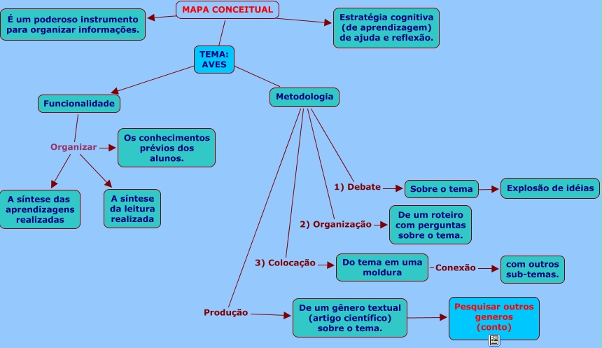 Este Cmap, tiene información relacionada con: Planejamento do tema aves 1, Funcionalidade Organizar A síntese das aprendizagens realizadas, De um gênero textual (artigo científico) sobre o tema. ???? Pesquisar outros generos (conto), MAPA CONCEITUAL ???? TEMA: AVES, Funcionalidade Organizar Os conhecimentos prévios dos alunos., MAPA CONCEITUAL ???? É um poderoso instrumento para organizar informações., TEMA: AVES ???? Metodologia, Sobre o tema ???? Explosão de idéias, Funcionalidade Organizar A síntese da leitura realizada, MAPA CONCEITUAL ???? Estratégia cognitiva (de aprendizagem) de ajuda e reflexão., Metodologia Produção De um gênero textual (artigo científico) sobre o tema., Metodologia 1) Debate Sobre o tema, TEMA: AVES ???? Funcionalidade, Metodologia 2) Organização De um roteiro com perguntas sobre o tema., Do tema em uma moldura Conexão com outros sub-temas., Metodologia 3) Colocação Do tema em uma moldura
