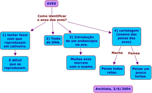 Este Cmap, tiene información relacionada con: Como identificar o sexo das aves, 3) Introdução de um endoscópio na ave. ???? Muitas aves morrem com o exame., AVES Como identificar o sexo das aves? 4) cariotagem (exame das penas das aves), AVES Como identificar o sexo das aves? 3) Introdução de um endoscópio na ave., AVES Como identificar o sexo das aves? 2) Teste de DNA., 4) cariotagem (exame das penas das aves) Macho Penas todas retas., AVES Como identificar o sexo das aves? 1) tentar fazer com que reproduzam em cativeiro., 4) cariotagem (exame das penas das aves) Femea Penas um pouco tortas., 1) tentar fazer com que reproduzam em cativeiro. ???? É difícil que se reproduzam.