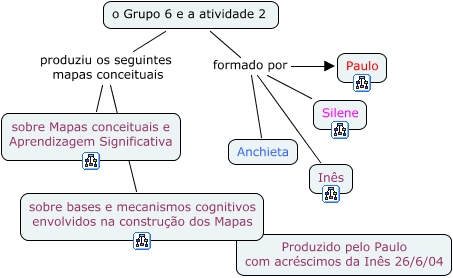 Este Cmap, tiene información relacionada con: Mapas do Grupo 6 - Sumário, o Grupo 6 e a atividade 2 produziu os seguintes mapas conceituais sobre Mapas conceituais e Aprendizagem Significativa, o Grupo 6 e a atividade 2 formado por Anchieta, o Grupo 6 e a atividade 2 formado por Inês, o Grupo 6 e a atividade 2 produziu os seguintes mapas conceituais sobre bases e mecanismos cognitivos envolvidos na construção dos Mapas, o Grupo 6 e a atividade 2 formado por Paulo, o Grupo 6 e a atividade 2 formado por Silene