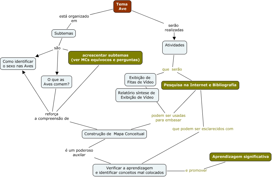 Este Cmap, tiene información relacionada con: Proposta Auxilia Reformulação Aprendizagem, Construção de Mapa Conceitual reforça a compreensão de Como identificar o sexo nas Aves, Construção de Mapa Conceitual reforça a compreensão de acrescentar subtemas (ver MCs equívocos e perguntas), Verificar a aprendizagem e identificar conceitos mal colocados e promover Aprendizagem significativa, Atividades que serão Exibição de Fitas de Vídeo, Subtemas são acrescentar subtemas (ver MCs equívocos e perguntas), Tema Ave está organizado em Subtemas, Verificar a aprendizagem e identificar conceitos mal colocados que podem ser esclarecidos com Pesquisa na Internet e Bibliografia, Construção de Mapa Conceitual reforça a compreensão de O que as Aves comem?, Subtemas são O que as Aves comem?, Tema Ave serão realizadas Atividades, Atividades que serão Pesquisa na Internet e Bibliografia, Construção de Mapa Conceitual é um poderoso auxilar Verificar a aprendizagem e identificar conceitos mal colocados, Subtemas são Como identificar o sexo nas Aves, Exibição de Fitas de Vídeo podem ser usadas para embasar Construção de Mapa Conceitual, Pesquisa na Internet e Bibliografia podem ser usadas para embasar Construção de Mapa Conceitual