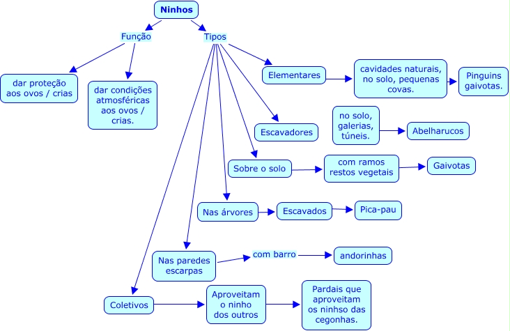 Este Cmap, tiene información relacionada con: Ninhos, Sobre o solo ???? com ramos restos vegetais, Ninhos Tipos Sobre o solo, Ninhos Tipos Coletivos, Nas árvores ???? Escavados, Ninhos Tipos Elementares, com ramos restos vegetais ???? Gaivotas, Coletivos ???? Aproveitam o ninho dos outros, Escavados ???? Pica-pau, cavidades naturais, no solo, pequenas covas. ???? Pinguins gaivotas., Aproveitam o ninho dos outros ???? Pardais que aproveitam os ninhso das cegonhas., Ninhos Função dar condições atmosféricas aos ovos / crias., Ninhos Função dar proteção aos ovos / crias, Nas paredes escarpas com barro andorinhas, Ninhos Tipos Escavadores, Elementares ???? cavidades naturais, no solo, pequenas covas., no solo, galerias, túneis. ???? Abelharucos, Ninhos Tipos Nas paredes escarpas, Ninhos Tipos Nas árvores