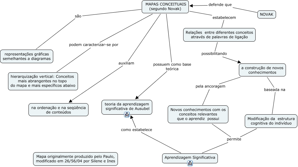 Este Cmap, tiene información relacionada con: Mapa 1 Grupo 6, Modificação da estrutura cognitiva do indivíduo permite Aprendizagem Significativa, MAPAS CONCEITUAIS (segundo Novak) são representações gráficas semelhantes a diagramas, Relações entre diferentes conceitos através de palavras de ligação possibilitando a construção de novos conhecimentos, a construção de novos conhecimentos pela ancoragem Novos conhecimentos com os conceitos relevantes que o aprendiz possui, MAPAS CONCEITUAIS (segundo Novak) estabelecem Relações entre diferentes conceitos através de palavras de ligação, a construção de novos conhecimentos baseada na Modificação da estrutura cognitiva do indivíduo, MAPAS CONCEITUAIS (segundo Novak) auxiliam na ordenação e na seqüência de conteúdos, Novos conhecimentos com os conceitos relevantes que o aprendiz possui permite Aprendizagem Significativa, MAPAS CONCEITUAIS (segundo Novak) podem caracterizar-se por hierarquização vertical: Conceitos mais abrangentes no topo do mapa e mais específicos abaixo, Aprendizagem Significativa como estabelece teoria da aprendizagem significativa de Ausubel, MAPAS CONCEITUAIS (segundo Novak) possuem como base teórica teoria da aprendizagem significativa de Ausubel, NOVAK defende que MAPAS CONCEITUAIS (segundo Novak)