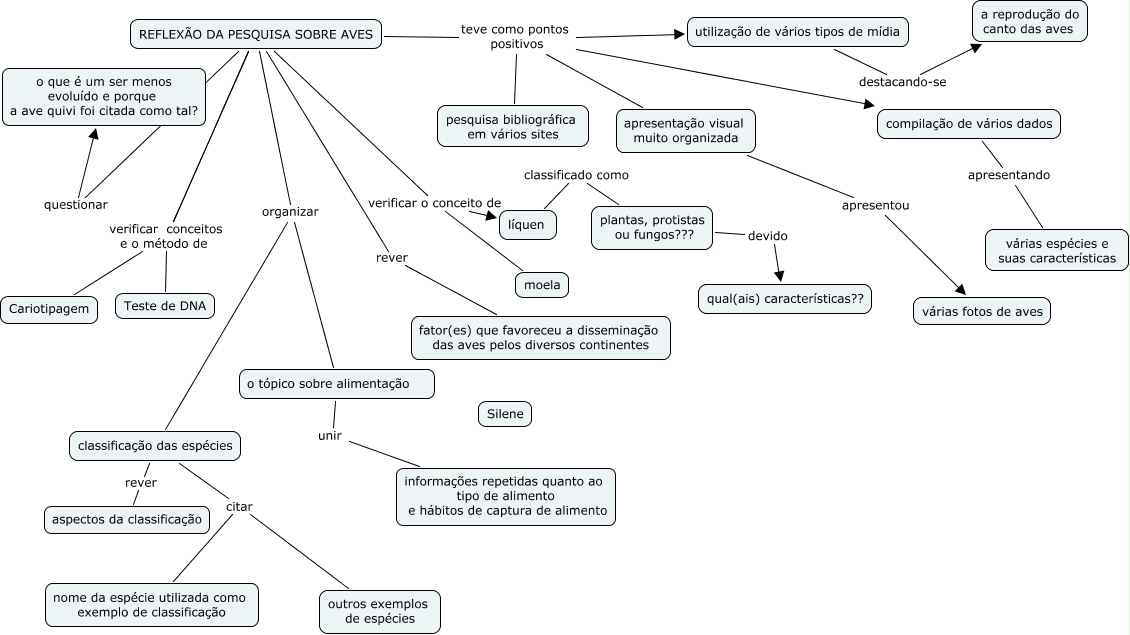 Este Cmap, tiene información relacionada con: Reflexão aves Silene1, REFLEXÃO DA PESQUISA SOBRE AVES verificar o conceito de moela, REFLEXÃO DA PESQUISA SOBRE AVES rever fator(es) que favoreceu a disseminação das aves pelos diversos continentes, REFLEXÃO DA PESQUISA SOBRE AVES organizar classificação das espécies, classificação das espécies rever aspectos da classificação, REFLEXÃO DA PESQUISA SOBRE AVES verificar o conceito de líquen, apresentação visual muito organizada apresentou várias fotos de aves, REFLEXÃO DA PESQUISA SOBRE AVES organizar o tópico sobre alimentação, REFLEXÃO DA PESQUISA SOBRE AVES teve como pontos positivos compilação de vários dados, REFLEXÃO DA PESQUISA SOBRE AVES verificar conceitos e o método de Cariotipagem, o tópico sobre alimentação unir informações repetidas quanto ao tipo de alimento e hábitos de captura de alimento, plantas, protistas ou fungos??? devido qual(ais) características??, REFLEXÃO DA PESQUISA SOBRE AVES verificar conceitos e o método de Cariotipagem, REFLEXÃO DA PESQUISA SOBRE AVES teve como pontos positivos apresentação visual muito organizada, REFLEXÃO DA PESQUISA SOBRE AVES teve como pontos positivos utilização de vários tipos de mídia, classificação das espécies citar outros exemplos de espécies, utilização de vários tipos de mídia destacando-se a reprodução do canto das aves, REFLEXÃO DA PESQUISA SOBRE AVES verificar conceitos e o método de Teste de DNA, REFLEXÃO DA PESQUISA SOBRE AVES verificar conceitos e o método de Teste de DNA, REFLEXÃO DA PESQUISA SOBRE AVES questionar o que é um ser menos evoluído e porque a ave quivi foi citada como tal?, classificação das espécies citar nome da espécie utilizada como exemplo de classificação