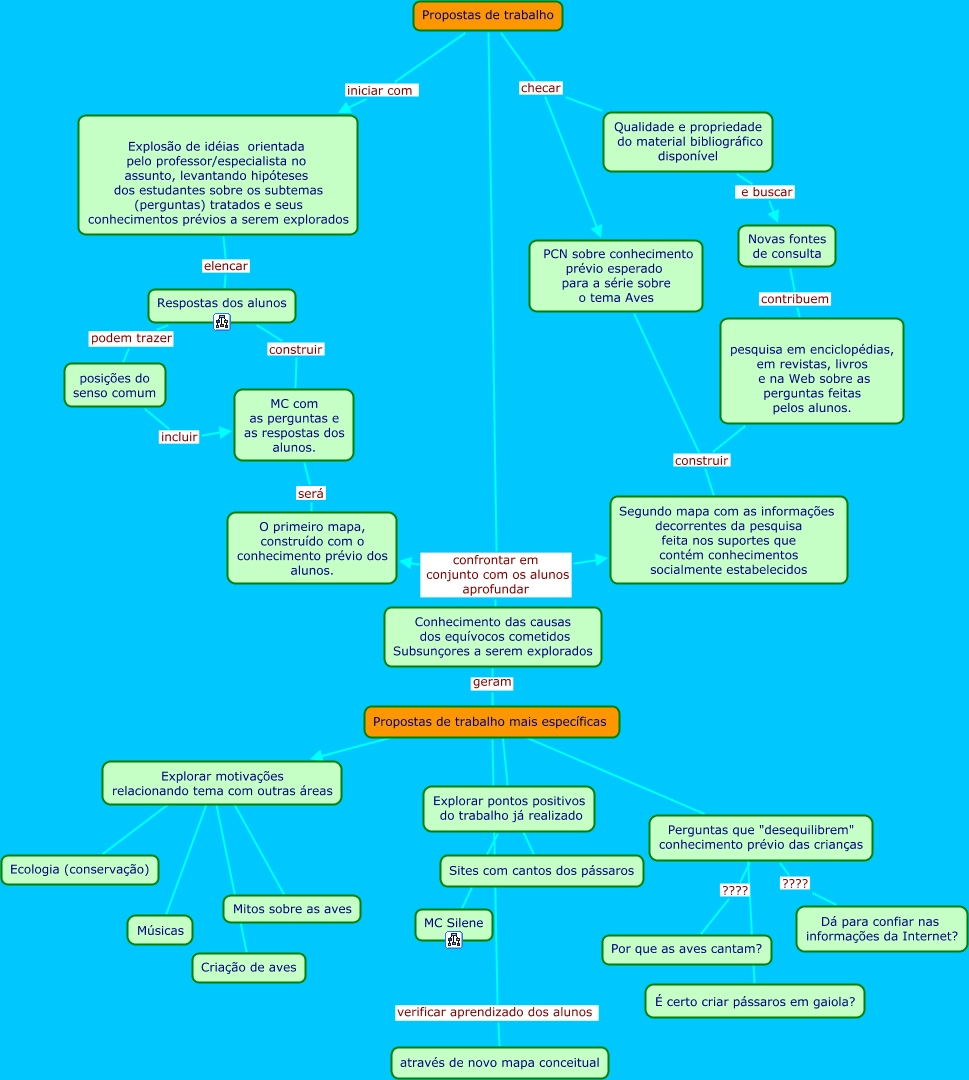 Este Cmap, tiene información relacionada con: Proposta de trabalho, Explorar motivações relacionando tema com outras áreas ???? Mitos sobre as aves, Propostas de trabalho mais específicas ???? Explorar motivações relacionando tema com outras áreas, Propostas de trabalho confrontar em conjunto com os alunos aprofundar Conhecimento das causas dos equívocos cometidos Subsunçores a serem explorados, Explorar pontos positivos do trabalho já realizado ???? Sites com cantos dos pássaros, PCN sobre conhecimento prévio esperado para a série sobre o tema Aves construir Segundo mapa com as informações decorrentes da pesquisa feita nos suportes que contém conhecimentos socialmente estabelecidos, Perguntas que "desequilibrem" conhecimento prévio das crianças ???? É certo criar pássaros em gaiola?, Propostas de trabalho confrontar em conjunto com os alunos aprofundar O primeiro mapa, construído com o conhecimento prévio dos alunos., Explorar pontos positivos do trabalho já realizado ???? MC Silene, Propostas de trabalho checar Qualidade e propriedade do material bibliográfico disponível, Respostas dos alunos construir MC com as perguntas e as respostas dos alunos., Conhecimento das causas dos equívocos cometidos Subsunçores a serem explorados geram Propostas de trabalho mais específicas, Propostas de trabalho mais específicas ???? Explorar pontos positivos do trabalho já realizado, Respostas dos alunos podem trazer posições do senso comum, Propostas de trabalho confrontar em conjunto com os alunos aprofundar Segundo mapa com as informações decorrentes da pesquisa feita nos suportes que contém conhecimentos socialmente estabelecidos, Perguntas que "desequilibrem" conhecimento prévio das crianças ???? Dá para confiar nas informações da Internet?, Explorar motivações relacionando tema com outras áreas ???? Músicas, Propostas de trabalho checar PCN sobre conhecimento prévio esperado para a série sobre o tema Aves, Propostas de trabalho iniciar com Explosão de idéias orientada pelo professor/especialista no assunto, levantando hipóteses dos estudantes sobre os subtemas (perguntas) tratados e seus conhecimentos prévios a serem explorados, Explosão de idéias orientada pelo professor/especialista no assunto, levantando hipóteses dos estudantes sobre os subtemas (perguntas) tratados e seus conhecimentos prévios a serem explorados elencar Respostas dos alunos, MC com as perguntas e as respostas dos alunos. será O primeiro mapa, construído com o conhecimento prévio dos alunos.