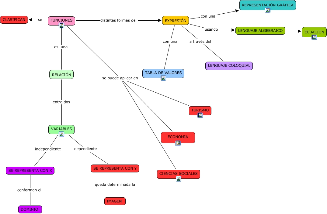 Este Cmap, tiene información relacionada con: FUNCIONES, SE REPRESENTA CON Y queda determinada la IMAGEN, FUNCIONES se puede aplicar en CIENCIAS SOCIALES, EXPRESIÓN a través del LENGUAJE COLOQUIAL, FUNCIONES distintas formas de EXPRESIÓN, FUNCIONES es una RELACIÓN, SE REPRESENTA CON X conforman el DOMINIO, FUNCIONES se CLASIFICAN, EXPRESIÓN con una TABLA DE VALORES, FUNCIONES se puede aplicar en ECONOMIA, RELACIÓN entre dos VARIABLES, VARIABLES independiente SE REPRESENTA CON X, EXPRESIÓN usando LENGUAJE ALGEBRAICO, EXPRESIÓN con una REPRESENTACIÓN GRÁFICA, LENGUAJE ALGEBRAICO ???? ECUACIÓN, VARIABLES dependiente SE REPRESENTA CON Y, FUNCIONES se puede aplicar en TURISMO