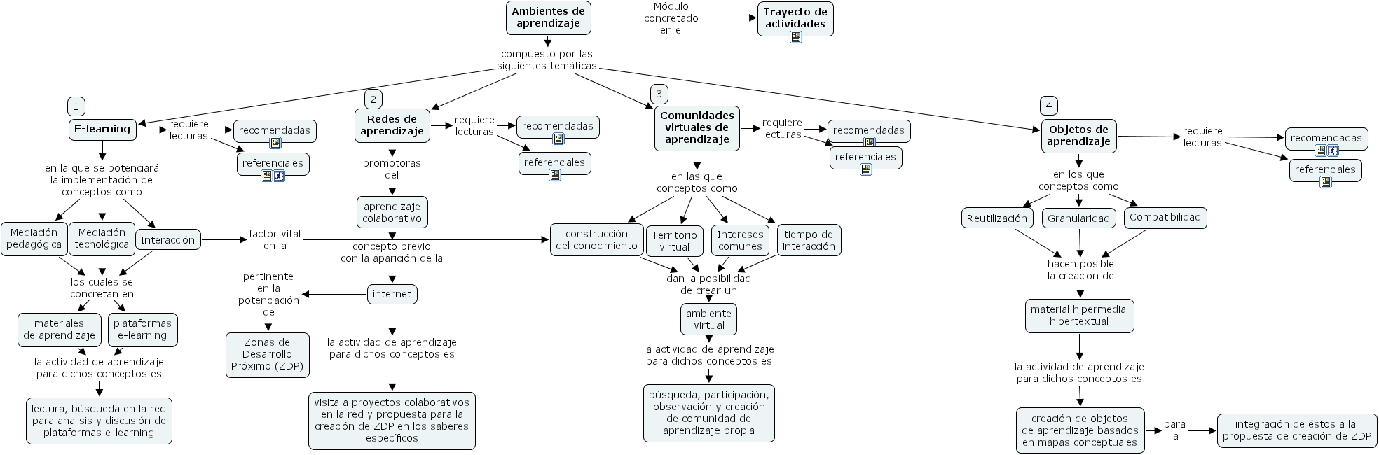 Comunidades virtuales de aprendizaje requiere lecturas recomendadas, Comunidades virtuales de aprendizaje requiere lecturas referenciales, E-learning en la que se potenciar� la implementaci�n de conceptos como Interacci�n, E-learning en la que se potenciar� la implementaci�n de conceptos como Mediaci�n pedag�gica, E-learning en la que se potenciar� la implementaci�n de conceptos como Mediaci�n tecnol�gica, Granularidad hacen posible la creacion de material hipermedial hipertextual, materiales de aprendizaje la actividad de aprendizaje para dichos conceptos es lectura, b�squeda en la red para analisis y discusi�n de plataformas e-learning, aprendizaje colaborativo concepto previo con la aparici�n de la internet, Reutilizaci�n hacen posible la creacion de material hipermedial hipertextual, creaci�n de objetos de aprendizaje basados en mapas conceptuales para la integraci�n de �stos a la propuesta de creaci�n de ZDP, Interacci�n los cuales se concretan en plataformas e-learning, Interacci�n los cuales se concretan en materiales de aprendizaje, internet pertinente en la potenciaci�n de Zonas de Desarrollo Pr�ximo (ZDP), tiempo de interacci�n dan la posibilidad de crear un ambiente virtual, Intereses comunes dan la posibilidad de crear un ambiente virtual, Objetos de aprendizaje en los que conceptos como Compatibilidad, Objetos de aprendizaje en los que conceptos como Reutilizaci�n, Objetos de aprendizaje en los que conceptos como Granularidad, Ambientes de aprendizaje compuesto por las siguientes tem�ticas Objetos de aprendizaje, Ambientes de aprendizaje compuesto por las siguientes tem�ticas E-learning, Ambientes de aprendizaje compuesto por las siguientes tem�ticas Comunidades virtuales de aprendizaje, Ambientes de aprendizaje compuesto por las siguientes tem�ticas Redes de aprendizaje, Interacci�n factor vital en la construcci�n del conocimiento, Compatibilidad hacen posible la creacion de material hipermedial hipertextual, plataformas e-learning la actividad de aprendizaje para dichos conceptos es lectura, b�squeda en la red para analisis y discusi�n de plataformas e-learning, Territorio virtual dan la posibilidad de crear un ambiente virtual, construcci�n del conocimiento dan la posibilidad de crear un ambiente virtual, Mediaci�n tecnol�gica los cuales se concretan en plataformas e-learning, Mediaci�n tecnol�gica los cuales se concretan en materiales de aprendizaje, material hipermedial hipertextual la actividad de aprendizaje para dichos conceptos es creaci�n de objetos de aprendizaje basados en mapas conceptuales, Objetos de aprendizaje requiere lecturas referenciales, Objetos de aprendizaje requiere lecturas recomendadas, Comunidades virtuales de aprendizaje en las que conceptos como tiempo de interacci�n, Comunidades virtuales de aprendizaje en las que conceptos como Intereses comunes, Comunidades virtuales de aprendizaje en las que conceptos como Territorio virtual, Comunidades virtuales de aprendizaje en las que conceptos como construcci�n del conocimiento, internet la actividad de aprendizaje para dichos conceptos es visita a proyectos colaborativos en la red y propuesta para la creaci�n de ZDP en los saberes espec�ficos, Mediaci�n pedag�gica los cuales se concretan en plataformas e-learning, Mediaci�n pedag�gica los cuales se concretan en materiales de aprendizaje, Redes de aprendizaje requiere lecturas recomendadas, Redes de aprendizaje requiere lecturas referenciales, Redes de aprendizaje promotoras del aprendizaje colaborativo, Ambientes de aprendizaje M�dulo concretado en el Trayecto de actividades, ambiente virtual la actividad de aprendizaje para dichos conceptos es b�squeda, participaci�n, observaci�n y creaci�n de comunidad de aprendizaje propia, E-learning requiere lecturas referenciales, E-learning requiere lecturas recomendadas