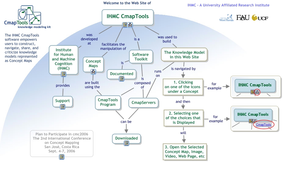 Este Cmap, tiene información relacionada con: CmapTools - Home Page Cmap Website, Software Toolkit is composed of CmapServers, The Knowledge Model in this Web Site is navigated by 1. Clicking on one of the icons under a Concept, The Knowledge Model in this Web Site runs on CmapServers, IHMC CmapTools is a Software Toolkit, Software Toolkit is composed of CmapTools Program, 1. Clicking on one of the icons under a Concept for example, IHMC CmapTools facilitates the manipulation of Concept Maps, CmapTools Program can be Downloaded, 2. Selecting one of the choices that is Displayed will 3. Open the Selected Concept Map, Image, Video, Web Page, etc, IHMC CmapTools was developed at Institute for Human and Machine Cognition (IHMC), Concept Maps are built using the CmapTools Program, 1. Clicking on one of the icons under a Concept and then 2. Selecting one of the choices that is Displayed, IHMC CmapTools was used to build The Knowledge Model in this Web Site, CmapServers can be Downloaded, 2. Selecting one of the choices that is Displayed for example, Software Toolkit is Documented, Institute for Human and Machine Cognition (IHMC) provides Support