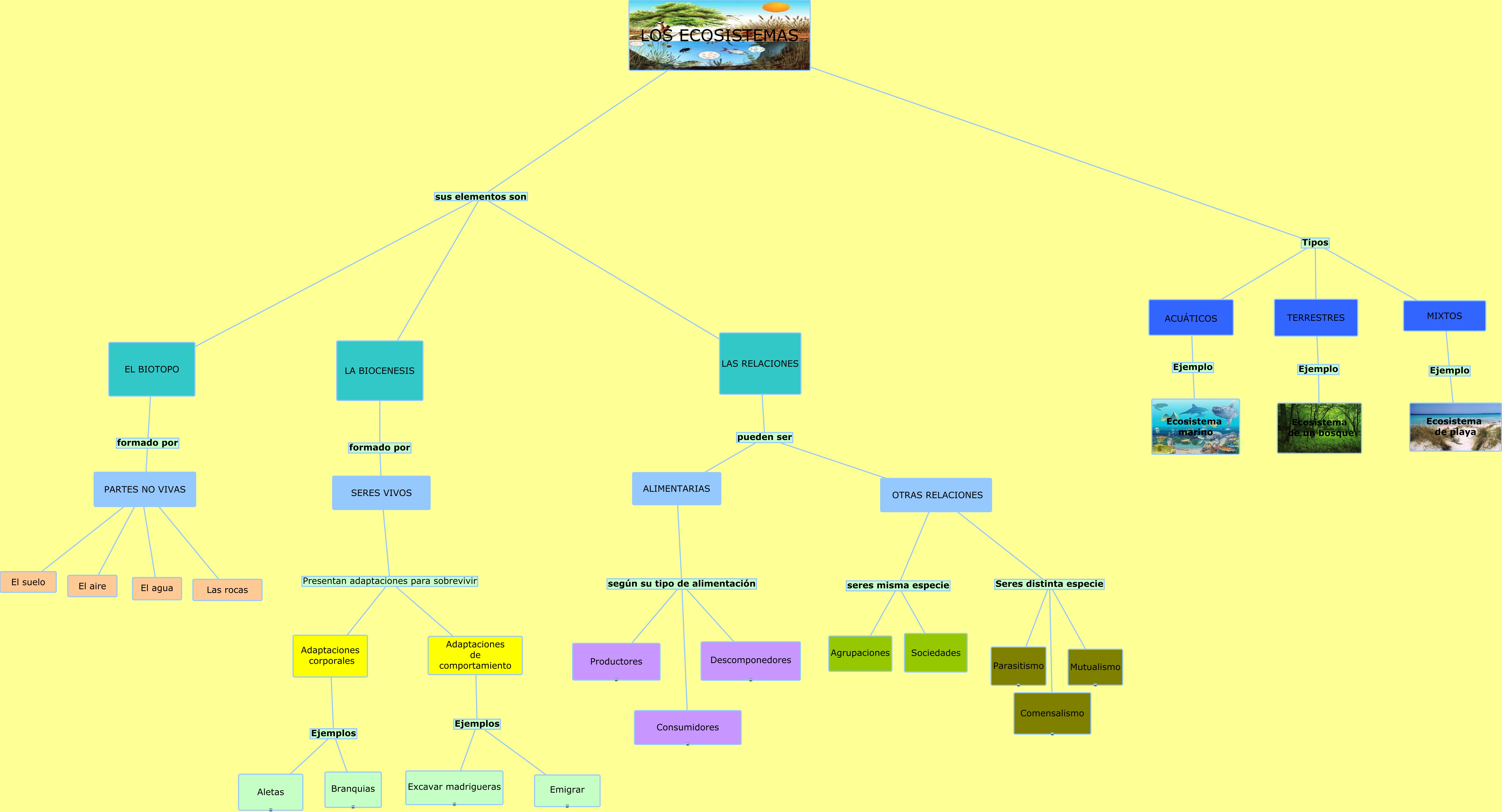 Este Cmap, tiene información relacionada con: ECOSISTEMAS, LAS RELACIONES pueden ser OTRAS RELACIONES, LOS ECOSISTEMAS sus elementos son EL BIOTOPO, OTRAS RELACIONES Seres distinta especie Parasitismo, Adaptaciones de comportamiento Ejemplos Excavar madrigueras, ALIMENTARIAS según su tipo de alimentación Descomponedores, MIXTOS Ejemplo Ecosistema de playa, OTRAS RELACIONES seres misma especie Sociedades, Adaptaciones corporales Ejemplos Branquias, LOS ECOSISTEMAS Tipos TERRESTRES, LOS ECOSISTEMAS Tipos ACUÁTICOS, SERES VIVOS Presentan adaptaciones para sobrevivir Adaptaciones de comportamiento, PARTES NO VIVAS ???? El suelo, PARTES NO VIVAS ???? Las rocas, LA BIOCENESIS formado por SERES VIVOS, ALIMENTARIAS según su tipo de alimentación Productores, ACUÁTICOS Ejemplo Ecosistema marino, ALIMENTARIAS según su tipo de alimentación Consumidores, LAS RELACIONES pueden ser ALIMENTARIAS, PARTES NO VIVAS ???? El agua, OTRAS RELACIONES seres misma especie Agrupaciones