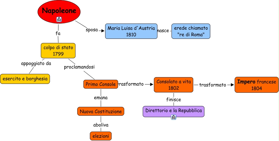 Questa Cmap, creata con IHMC CmapTools, contiene informazioni relative a: Napoleone_impero, Nuova Costituzione aboliva elezioni, Napoleone sposa Maria Luisa d'Austria 1810, colpo di stato 1799 appoggiato da esercito e borghesia, Napoleone fa colpo di stato 1799, Primo Console emana Nuova Costituzione, colpo di stato 1799 proclamandosi Primo Console, Primo Console trasformato Consolato a vita 1802, Maria Luisa d'Austria 1810 nasce erede chiamato "re di Roma", Consolato a vita 1802 finisce Direttorio e la Repubblica, Consolato a vita 1802 trasformato Impero francese 1804