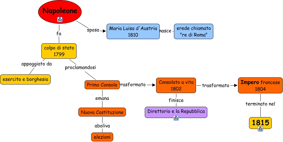 Questa Cmap, creata con IHMC CmapTools, contiene informazioni relative a: Napoleone_impero, Napoleone sposa Maria Luisa d'Austria 1810, Nuova Costituzione aboliva elezioni, Impero francese 1804 terminato nel 1815, colpo di stato 1799 appoggiato da esercito e borghesia, Napoleone fa colpo di stato 1799, colpo di stato 1799 proclamandosi Primo Console, Primo Console emana Nuova Costituzione, Maria Luisa d'Austria 1810 nasce erede chiamato "re di Roma", Primo Console trasformato Consolato a vita 1802, Consolato a vita 1802 finisce Direttorio e la Repubblica, Consolato a vita 1802 trasformato Impero francese 1804