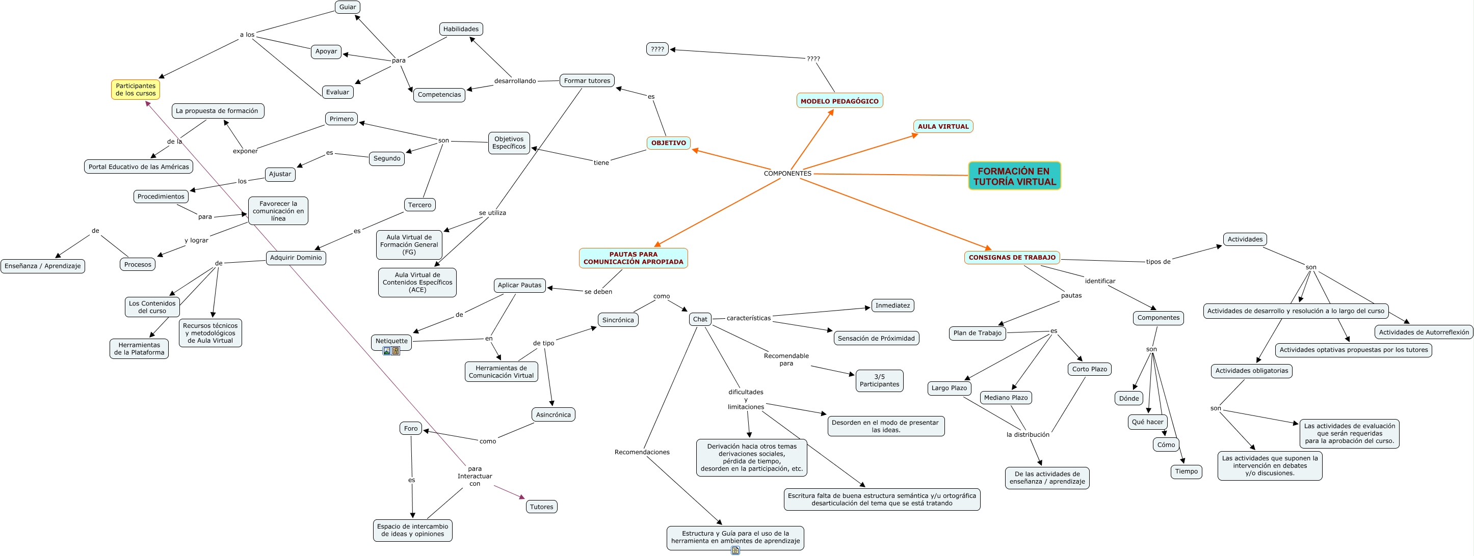 Este Cmap, tiene información relacionada con: Bloque I - Formación en Tutoría Virtual, Adquirir Dominio de Herramientas de la Plataforma, Sincrónica como Chat, Herramientas de Comunicación Virtual de tipo Asincrónica, Segundo es Ajustar, Habilidades para Competencias, FORMACIÓN EN TUTORÍA VIRTUAL COMPONENTES PAUTAS PARA COMUNICACIÓN APROPIADA, OBJETIVO tiene Objetivos Específicos, PAUTAS PARA COMUNICACIÓN APROPIADA se deben Aplicar Pautas, Asincrónica como Foro, Habilidades para Apoyar, CONSIGNAS DE TRABAJO pautas Plan de Trabajo, Espacio de intercambio de ideas y opiniones para Interactuar con Tutores, Ajustar los Procedimientos, OBJETIVO es Formar tutores, Actividades son Actividades de Autorreflexión, Actividades son Actividades optativas propuestas por los tutores, Corto Plazo la distribución De las actividades de enseñanza / aprendizaje, Plan de Trabajo es Corto Plazo, Evaluar a los Participantes de los cursos, Objetivos Específicos son Segundo