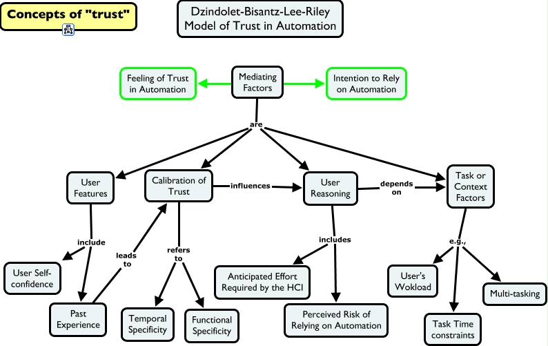This Concept Map, created with IHMC CmapTools, has information related to: Trust in Automation-DBLR Model of Trust, Task or Context Factors e.g., Multi-tasking, User Features include User Self- confidence, Task or Context Factors e.g., User's Wokload, Past Experience leads to Calibration of Trust, User Features include Past Experience, User Reasoning includes Anticipated Effort Required by the HCI, Mediating Factors are User Features, User Reasoning depends on Task or Context Factors, Calibration of Trust refers to Functional Specificity, Mediating Factors are Calibration of Trust, Calibration of Trust refers to Temporal Specificity, Mediating Factors are User Reasoning, Mediating Factors are Task or Context Factors, Intention to Rely on Automation Feeling of Trust in Automation, Calibration of Trust influences User Reasoning, User Reasoning includes Perceived Risk of Relying on Automation, Task or Context Factors e.g., Task Time constraints
