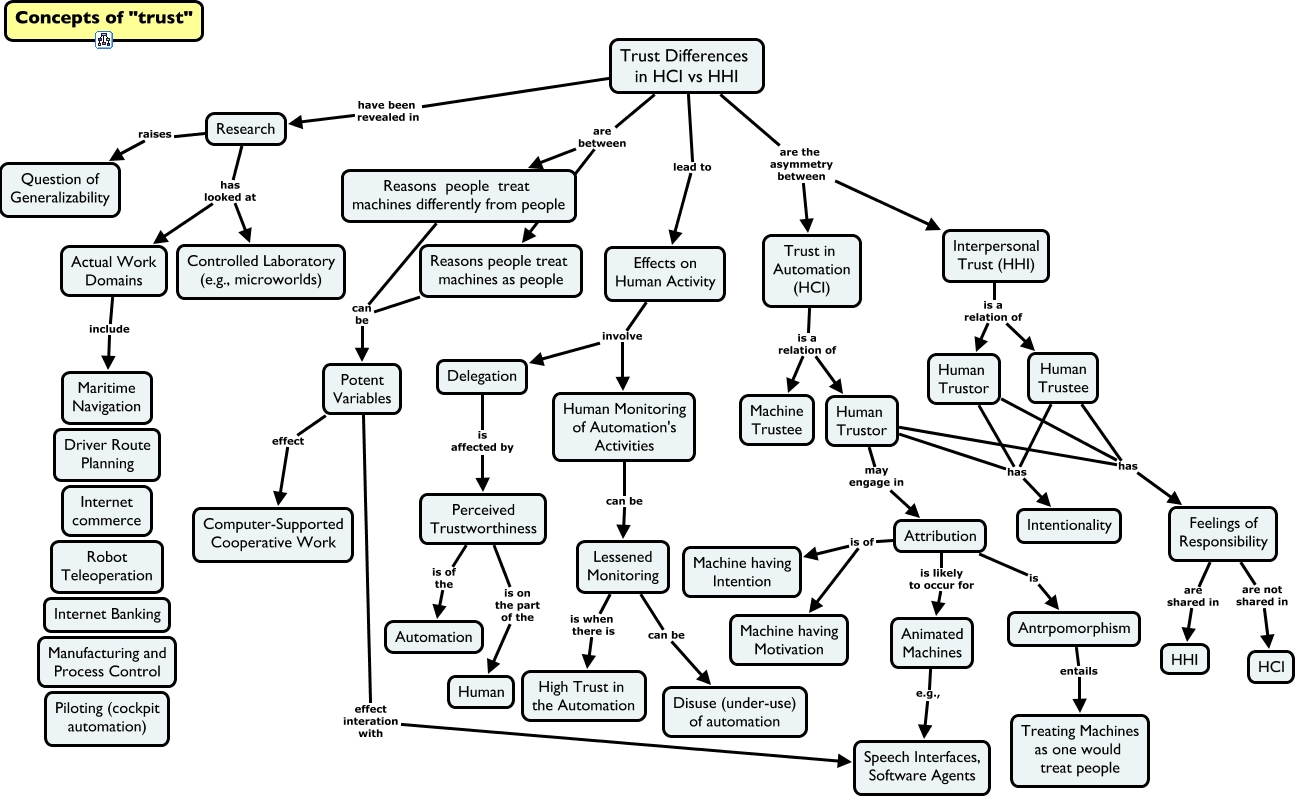 This Concept Map, created with IHMC CmapTools, has information related to: HCI vs HHI-Trust Differences, Potent Variables effect interation with Speech Interfaces, Software Agents, Human Trustor has Intentionality, Trust Differences in HCI vs HHI are between Reasons people treat machines as people, Attribution is Antrpomorphism, Lessened Monitoring can be Disuse (under-use) of automation, Reasons people treat machines differently from people can be Potent Variables, Antrpomorphism entails Treating Machines as one would treat people, Human Monitoring of Automation's Activities can be Lessened Monitoring, Trust Differences in HCI vs HHI are between Reasons people treat machines differently from people, Potent Variables effect Computer-Supported Cooperative Work, Attribution is of Machine having Intention, Research has looked at Controlled Laboratory (e.g., microworlds), Research has looked at Actual Work Domains, Trust Differences in HCI vs HHI are the asymmetry between Trust in Automation (HCI), Animated Machines e.g., Speech Interfaces, Software Agents, Feelings of Responsibility are shared in HHI, Human Trustor has Feelings of Responsibility, Actual Work Domains include Maritime Navigation, Interpersonal Trust (HHI) is a relation of Human Trustor, Feelings of Responsibility are not shared in HCI
