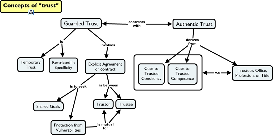 This Concept Map, created with IHMC CmapTools, has information related to: The Concept of Trust-Guarded Trust, Guarded Trust is Restricted in Specificity, Authentic Trust derives from Trustee's Office, Profession, or Title, Guarded Trust is Temporary Trust, Explicit Agreement or contract is between Trustor, Explicit Agreement or contract is between Trustee, Authentic Trust derives from Cues to Trustee Competence, Authentic Trust derives from Cues to Trustee Consisency, Protection from Vulnerabilities is mutual for Trustee, Explicit Agreement or contract is to seek Protection from Vulnerabilities, Explicit Agreement or contract is to seek Shared Goals, Guarded Trust involves Explicit Agreement or contract, Protection from Vulnerabilities is mutual for Trustor
