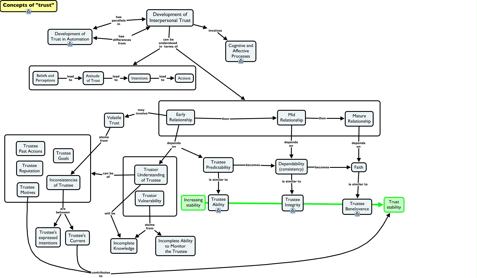 This Concept Map, created with IHMC CmapTools, has information related to: Interpersonal Trust-Development of Interpersonal Trust, Trustee Predictability becomes Dependability (consistency), Dependability (consistency) is similar to Trustee Integrity, Early Relationship then Mid Relationship, Faith is similar to Trustee Benelovence, Trustor Understanding of Trustee can be of ????, Intentions lead to Actions, Development of Interpersonal Trust involves Cogntive and Affective Processes, Attitude of Trust lead to Intentions, Trustor Understanding of Trustee will be Incomplete Knowledge, Trustee's Current contributes to Trust stability, Trustor Vulnerability stems from Incomplete Ability to Monitor the Trustee, Inconsistencies of Trustee are between Trustee's Current, Development of Interpersonal Trust can be understood in terms of ????, Inconsistencies of Trustee are between Trustee's expressed intentions, Dependability (consistency) becomes Faith, Early Relationship may involve Volatile Trust, Mature Relationship depends on Faith, Trustor Vulnerability stems from Incomplete Knowledge, Volatile Trust stems from Inconsistencies of Trustee, Trustee Motives contributes to Trust stability