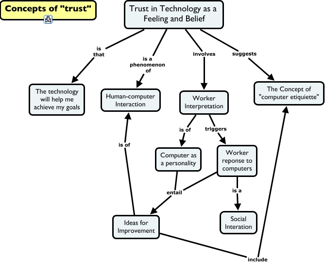 This Concept Map, created with IHMC CmapTools, has information related to: Trust in Automation -Trust as Feeling and Belief, Ideas for Improvement include The Concept of "computer etiquiette", Worker Interpretation is of Computer as a personality, Trust in Technology as a Feeling and Belief is that The technology will help me achieve my goals, Worker reponse to computers is a Social Interation, Trust in Technology as a Feeling and Belief involves Worker Interpretation, Worker reponse to computers entail Ideas for Improvement, Trust in Technology as a Feeling and Belief is a phenomenon of Human-computer Interaction, Computer as a personality entail Ideas for Improvement, Trust in Technology as a Feeling and Belief suggests The Concept of "computer etiquiette", Worker Interpretation triggers Worker reponse to computers, Ideas for Improvement is of Human-computer Interaction