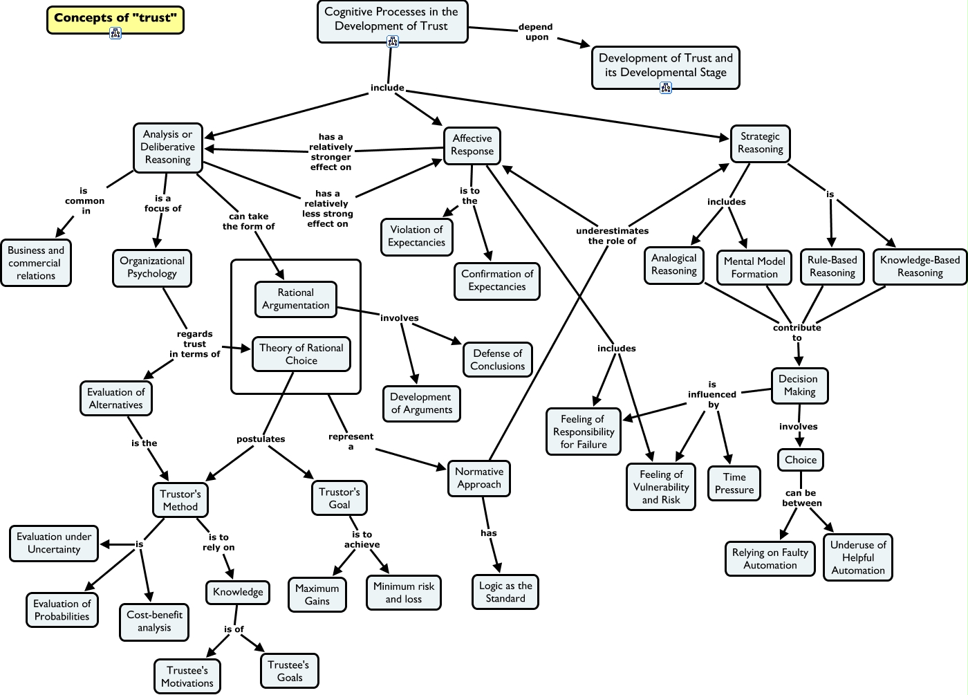 This Concept Map, created with IHMC CmapTools, has information related to: Interpersonal Trust-Cognitive Processes in Development of Trust, Decision Making is influenced by Time Pressure, Cognitive Processes in the Development of Trust depend upon Development of Trust and its Developmental Stage, Organizational Psychology regards trust in terms of Evaluation of Alternatives, Trustor's Method is Evaluation under Uncertainty, Trustor's Method is to rely on Knowledge, Rational Argumentation involves Defense of Conclusions, Rational Argumentation involves Development of Arguments, Cognitive Processes in the Development of Trust include Affective Response, Analysis or Deliberative Reasoning has a relatively less strong effect on Affective Response, Analysis or Deliberative Reasoning is a focus of Organizational Psychology, Strategic Reasoning is Rule-Based Reasoning, Analogical Reasoning contribute to Decision Making, Strategic Reasoning includes Mental Model Formation, Decision Making involves Choice, Decision Making is influenced by Feeling of Responsibility for Failure, Strategic Reasoning includes Analogical Reasoning, Affective Response has a relatively stronger effect on Analysis or Deliberative Reasoning, Organizational Psychology regards trust in terms of Theory of Rational Choice, Trustor's Goal is to achieve Minimum risk and loss, Knowledge-Based Reasoning contribute to Decision Making