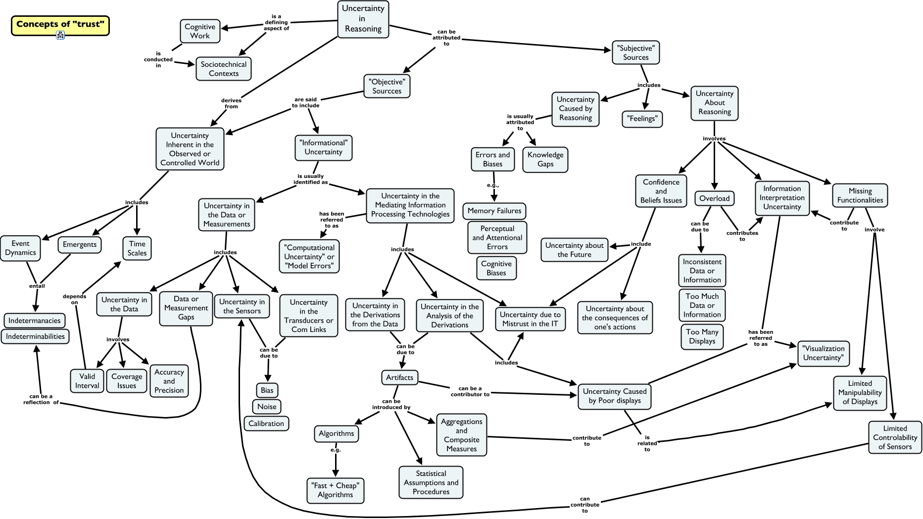 This Concept Map, created with IHMC CmapTools, has information related to: Trust in Automation-Operator's Uncertainty, Uncertainty in the Analysis of the Derivations can be due to Artifacts, Uncertainty in the Mediating Information Processing Technologies includes Uncertainty due to Mistrust in the IT, Uncertainty Caused by Poor displays is related to Limited Manipulability of Displays, Confidence and Beliefs Issues include Uncertainty due to Mistrust in the IT, Artifacts can be introduced by Aggregations and Composite Measures, "Subjective" Sources includes Uncertainty About Reasoning, Confidence and Beliefs Issues include Uncertainty about the consequences of one's actions, Uncertainty in Reasoning derives from Uncertainty Inherent in the Observed or Controlled World, Uncertainty About Reasoning involves Information Interpretation Uncertainty, Valid Interval depends on Time Scales, "Subjective" Sources includes "Feelings", "Objective" Sourcces are said to include Uncertainty Inherent in the Observed or Controlled World, Data or Measurement Gaps can be a reflection of Indeterminabilities, Missing Functionalities involve Limited Manipulability of Displays, Uncertainty in the Mediating Information Processing Technologies has been referred to as "Computational Uncertainty" or "Model Errors", Overload can be due to Inconsistent Data or Information, Information Interpretation Uncertainty has been referred to as "Visualization Uncertainty", "Informational" Uncertainty is usually identified as Uncertainty in the Data or Measurements, Algorithms e.g. "Fast + Cheap" Algorithms, Uncertainty in the Data involves Accuracy and Precision