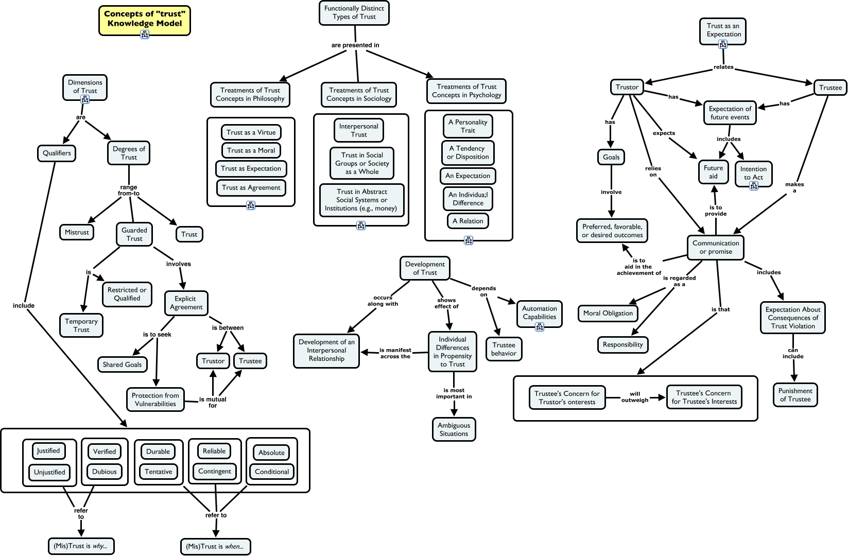 This Concept Map, created with IHMC CmapTools, has information related to: The Concept of Trust, Communication or promise is that ????, refer to (Mis)Trust is why..., Trust as an Expectation relates Trustor, Trustee has Expectation of future events, Goals involve Preferred, favorable, or desired outcomes, Trustor has Goals, refer to (Mis)Trust is why..., Explicit Agreement is between Trustee, Individual Differences in Propensity to Trust is most important in Ambiguous Situations, Trustee's Concern for Trustor's onterests will outweigh Trustee's Concern for Trustee's Interests, Communication or promise is regarded as a Responsibility, Development of Trust occurs along with Development of an Interpersonal Relationship, ???? refer to (Mis)Trust is when..., Trust as an Expectation relates Trustee, Communication or promise is to aid in the achievement of Preferred, favorable, or desired outcomes, Explicit Agreement is to seek Shared Goals, Communication or promise is to provide Future aid, Expectation of future events includes Future aid, Guarded Trust involves Explicit Agreement, Trustor relies on Communication or promise