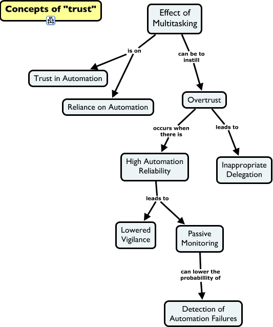 This Concept Map, created with IHMC CmapTools, has information related to: Trust in Automation-Effect of Multitasking, Overtrust occurs when there is High Automation Reliability, Overtrust leads to Inappropriate Delegation, High Automation Reliability leads to Lowered Vigilance, Effect of Multitasking can be to instill Overtrust, Passive Monitoring can lower the probabillity of Detection of Automation Failures, High Automation Reliability leads to Passive Monitoring, Effect of Multitasking is on Reliance on Automation, Effect of Multitasking is on Trust in Automation