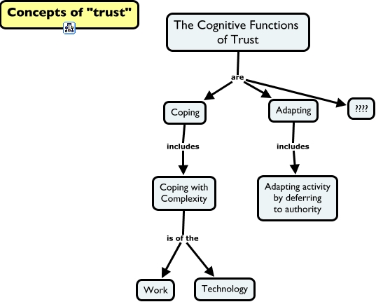 This Concept Map, created with IHMC CmapTools, has information related to: Functionality of Trust-Cognitive, The Cognitive Functions of Trust are Adapting, Coping with Complexity is of the Technology, Coping with Complexity is of the Work, The Cognitive Functions of Trust are ????, Coping includes Coping with Complexity, Adapting includes Adapting activity by deferring to authority, The Cognitive Functions of Trust are Coping