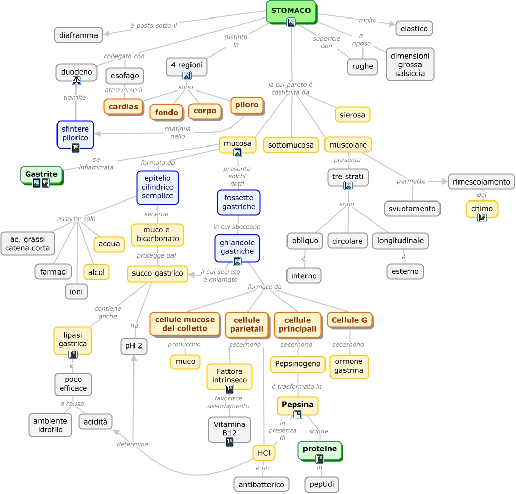 Questa Cmap, creata con IHMC CmapTools, contiene informazioni relative a: Stomaco, STOMACO distinto in 4 regioni, mucosa formata da epitelio cilindrico semplice, mucosa se infiammata Gastrite, epitelio cilindrico semplice assorbe solo acqua, poco efficace a causa acidità, ghiandole gastriche formate da cellule mucose del colletto, piloro continua nello sfintere pilorico, obliquo è interno, fossette gastriche in cui sboccano ghiandole gastriche, ghiandole gastriche il cui secreto è chiamato succo gastrico, proteine in peptidi, STOMACO molto elastico, cellule parietali secernono Fattore intrinseco, STOMACO è posto sotto il diaframma, mucosa presenta solchi detti fossette gastriche, 4 regioni sono piloro, STOMACO supericie con rughe, STOMACO a riposo rughe, STOMACO la cui parete è costituita da muscolare, tre strati sono obliquo