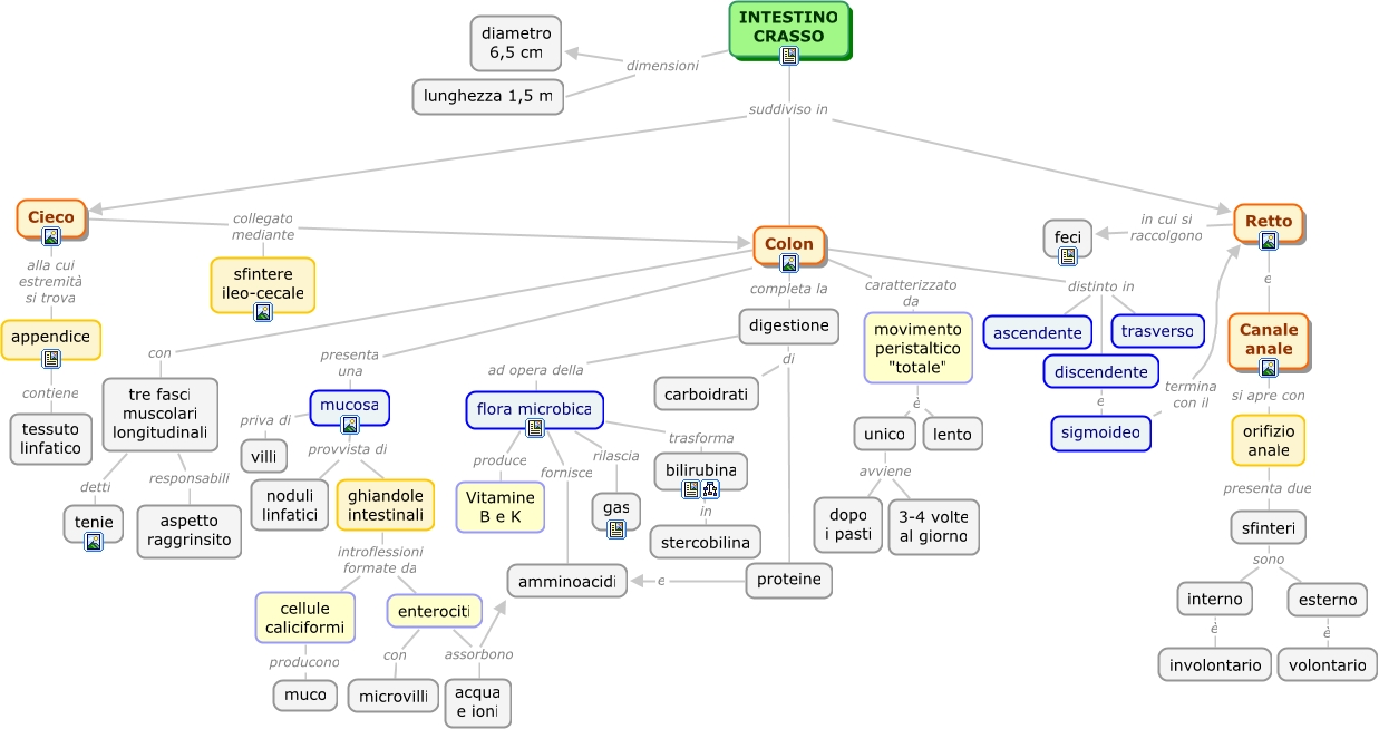 Questa Cmap, creata con IHMC CmapTools, contiene informazioni relative a: Intestino crasso, Colon caratterizzato da movimento peristaltico "totale", unico avviene dopo i pasti, INTESTINO CRASSO dimensioni diametro 6,5 cm, Cieco collegato mediante Colon, Colon con tre fasci muscolari longitudinali, interno è involontario, digestione ad opera della flora microbica, orifizio anale presenta due sfinteri, tre fasci muscolari longitudinali responsabili aspetto raggrinsito, sigmoideo termina con il Retto, INTESTINO CRASSO suddiviso in Colon, mucosa priva di villi, INTESTINO CRASSO suddiviso in Retto, bilirubina in stercobilina, sfinteri sono esterno, Retto in cui si raccolgono feci, Cieco alla cui estremità si trova appendice, esterno è volontario, flora microbica trasforma bilirubina, INTESTINO CRASSO dimensioni lunghezza 1,5 m