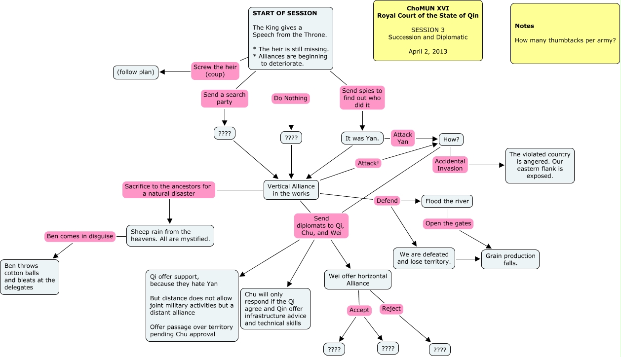 This Concept Map, created with IHMC CmapTools, has information related to: Succession and Diplomatic, How? Send diplomats to Qi, Chu, and Wei Chu will only respond if the Qi agree and Qin offer infrastructure advice and technical skills, How? Accidental Invasion The violated country is angered. Our eastern flank is exposed., Vertical Alliance in the works Attack! How?, Vertical Alliance in the works Defend We are defeated and lose territory., Wei offer horizontal Alliance Accept ????, Sheep rain from the heavens. All are mystified. Ben comes in disguise Ben throws cotton balls and bleats at the delegates, How? Send diplomats to Qi, Chu, and Wei Wei offer horizontal Alliance, START OF SESSION The King gives a Speech from the Throne. * The heir is still missing. * Alliances are beginning to deteriorate. Send spies to find out who did it It was Yan., START OF SESSION The King gives a Speech from the Throne. * The heir is still missing. * Alliances are beginning to deteriorate. Send a search party ????, Wei offer horizontal Alliance Reject ????, It was Yan. Vertical Alliance in the works, Vertical Alliance in the works Send diplomats to Qi, Chu, and Wei Qi offer support, because they hate Yan But distance does not allow joint military activities but a distant alliance Offer passage over territory pending Chu approval, Flood the river Open the gates Grain production falls., Vertical Alliance in the works Send diplomats to Qi, Chu, and Wei Wei offer horizontal Alliance, START OF SESSION The King gives a Speech from the Throne. * The heir is still missing. * Alliances are beginning to deteriorate. Do Nothing ????, How? Send diplomats to Qi, Chu, and Wei Qi offer support, because they hate Yan But distance does not allow joint military activities but a distant alliance Offer passage over territory pending Chu approval, Vertical Alliance in the works Defend Flood the river, It was Yan. Attack Yan How?, Vertical Alliance in the works Sacrifice to the ancestors for a natural disaster Sheep rain from the heavens. All are mystified., Wei offer horizontal Alliance Accept ????