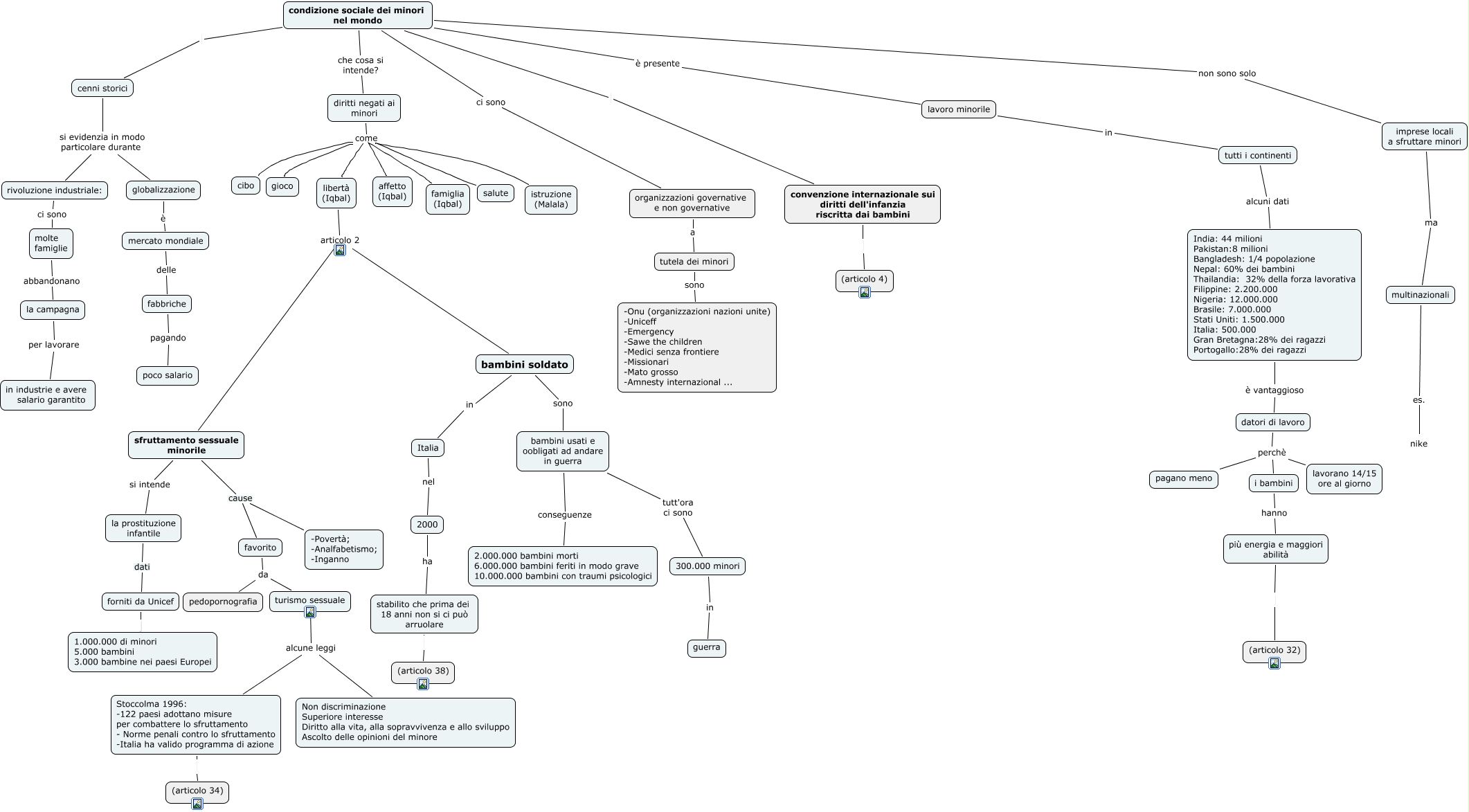Questa Cmap, creata con IHMC CmapTools, contiene informazioni relative a: smsza-mappa_condizione_minori-gr1, tutela dei minori sono -Onu (organizzazioni nazioni unite) -Uniceff -Emergency -Sawe the children -Medici senza frontiere -Missionari -Mato grosso -Amnesty internazional ..., molte famiglie abbandonano la campagna, diritti negati ai minori come salute, diritti negati ai minori come affetto (Iqbal), imprese locali a sfruttare minori ma multinazionali, lavoro minorile in tutti i continenti, sfruttamento sessuale minorile cause -Povertà; -Analfabetismo; -Inganno, globalizzazione è mercato mondiale, bambini usati e oobligati ad andare in guerra tutt'ora ci sono 300.000 minori, la campagna per lavorare in industrie e avere salario garantito, favorito da pedopornografia, favorito da turismo sessuale, datori di lavoro perchè i bambini, tutti i continenti alcuni dati India: 44 milioni Pakistan:8 milioni Bangladesh: 1/4 popolazione Nepal: 60% dei bambini Thailandia: 32% della forza lavorativa Filippine: 2.200.000 Nigeria: 12.000.000 Brasile: 7.000.000 Stati Uniti: 1.500.000 Italia: 500.000 Gran Bretagna:28% dei ragazzi Portogallo:28% dei ragazzi, diritti negati ai minori come famiglia (Iqbal), fabbriche pagando poco salario, diritti negati ai minori come libertà (Iqbal), condizione sociale dei minori nel mondo che cosa si intende? diritti negati ai minori, più energia e maggiori abilità (articolo 32), turismo sessuale alcune leggi Non discriminazione Superiore interesse Diritto alla vita, alla sopravvivenza e allo sviluppo Ascolto delle opinioni del minore