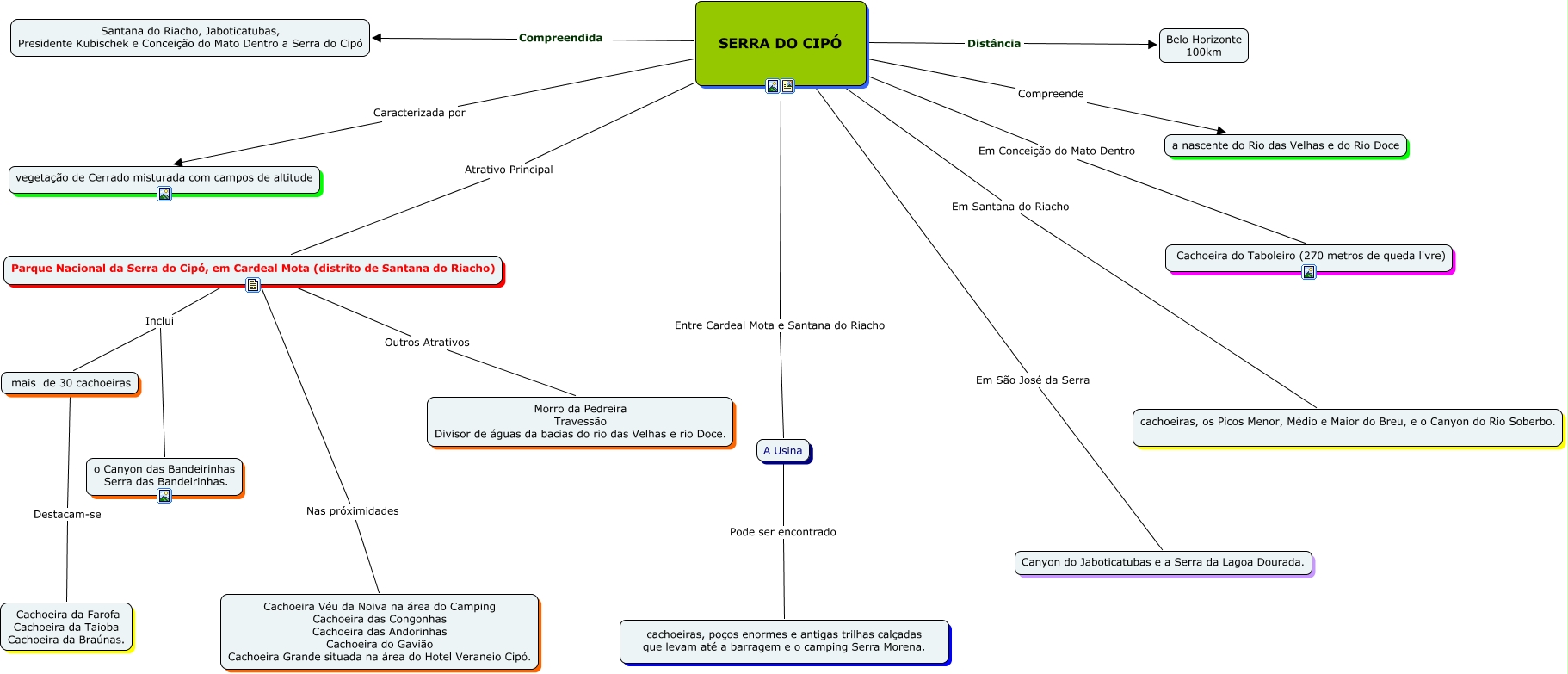 Esse mapa conceitual, produzido no IHMC CmapTools, tem a informação relacionada a: Mapa Serra do Cipó, SERRA DO CIPÓ Compreende a nascente do Rio das Velhas e do Rio Doce, SERRA DO CIPÓ Atrativo Principal Parque Nacional da Serra do Cipó, em Cardeal Mota (distrito de Santana do Riacho), Parque Nacional da Serra do Cipó, em Cardeal Mota (distrito de Santana do Riacho) Nas próximidades Cachoeira Véu da Noiva na área do Camping Cachoeira das Congonhas Cachoeira das Andorinhas Cachoeira do Gavião Cachoeira Grande situada na área do Hotel Veraneio Cipó., SERRA DO CIPÓ Em Conceição do Mato Dentro Cachoeira do Taboleiro (270 metros de queda livre), SERRA DO CIPÓ Caracterizada por vegetação de Cerrado misturada com campos de altitude, SERRA DO CIPÓ Em Santana do Riacho cachoeiras, os Picos Menor, Médio e Maior do Breu, e o Canyon do Rio Soberbo., SERRA DO CIPÓ Distância Belo Horizonte 100km, Parque Nacional da Serra do Cipó, em Cardeal Mota (distrito de Santana do Riacho) Inclui mais de 30 cachoeiras, Parque Nacional da Serra do Cipó, em Cardeal Mota (distrito de Santana do Riacho) Inclui o Canyon das Bandeirinhas Serra das Bandeirinhas., A Usina Pode ser encontrado cachoeiras, poços enormes e antigas trilhas calçadas que levam até a barragem e o camping Serra Morena., SERRA DO CIPÓ Entre Cardeal Mota e Santana do Riacho A Usina, SERRA DO CIPÓ Compreendida Santana do Riacho, Jaboticatubas, Presidente Kubischek e Conceição do Mato Dentro a Serra do Cipó, Parque Nacional da Serra do Cipó, em Cardeal Mota (distrito de Santana do Riacho) Outros Atrativos Morro da Pedreira Travessão Divisor de águas da bacias do rio das Velhas e rio Doce., mais de 30 cachoeiras Destacam-se Cachoeira da Farofa Cachoeira da Taioba Cachoeira da Braúnas., SERRA DO CIPÓ Em São José da Serra Canyon do Jaboticatubas e a Serra da Lagoa Dourada.