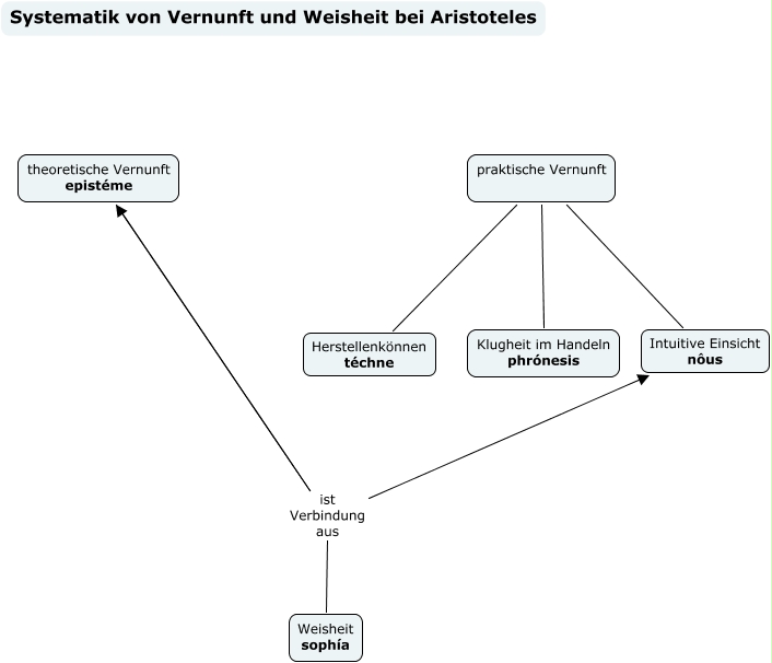 Dieses mit IHMC CmapTools erstellte CMap hat Informationen bezüglich: Systematik von Vernunft und Weisheit bei Aristoteles, praktische Vernunft Klugheit im Handeln phrónesis, theoretische Vernunft epistéme ist Verbindung aus Intuitive Einsicht nôus, praktische Vernunft Intuitive Einsicht nôus, theoretische Vernunft epistéme ist Verbindung aus Weisheit sophía, praktische Vernunft Herstellenkönnen téchne