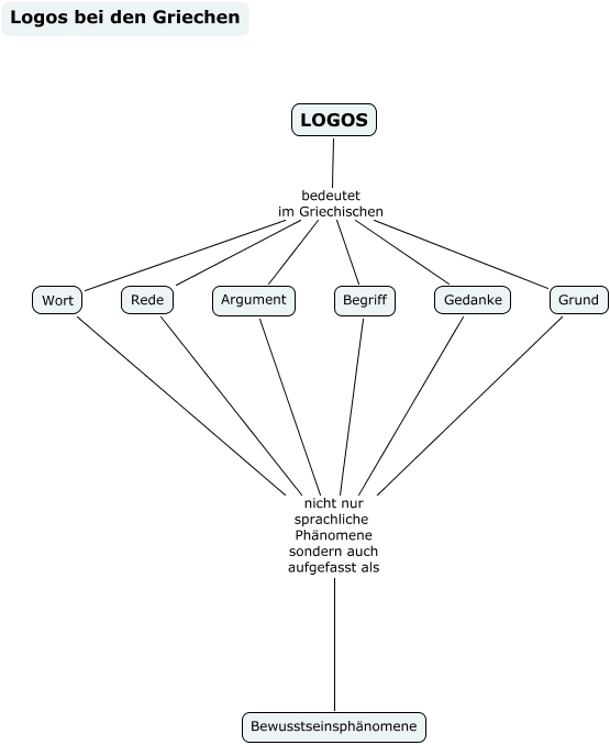 Dieses mit IHMC CmapTools erstellte CMap hat Informationen bezüglich: Logos bei den Griechen, LOGOS bedeutet im Griechischen Gedanke, LOGOS bedeutet im Griechischen Begriff, Grund nicht nur sprachliche Phänomene sondern auch aufgefasst als Bewusstseinsphänomene, Argument nicht nur sprachliche Phänomene sondern auch aufgefasst als Bewusstseinsphänomene, LOGOS bedeutet im Griechischen Grund, Gedanke nicht nur sprachliche Phänomene sondern auch aufgefasst als Bewusstseinsphänomene, LOGOS bedeutet im Griechischen Rede, LOGOS bedeutet im Griechischen Wort, LOGOS bedeutet im Griechischen Argument, Wort nicht nur sprachliche Phänomene sondern auch aufgefasst als Bewusstseinsphänomene, Begriff nicht nur sprachliche Phänomene sondern auch aufgefasst als Bewusstseinsphänomene, Rede nicht nur sprachliche Phänomene sondern auch aufgefasst als Bewusstseinsphänomene
