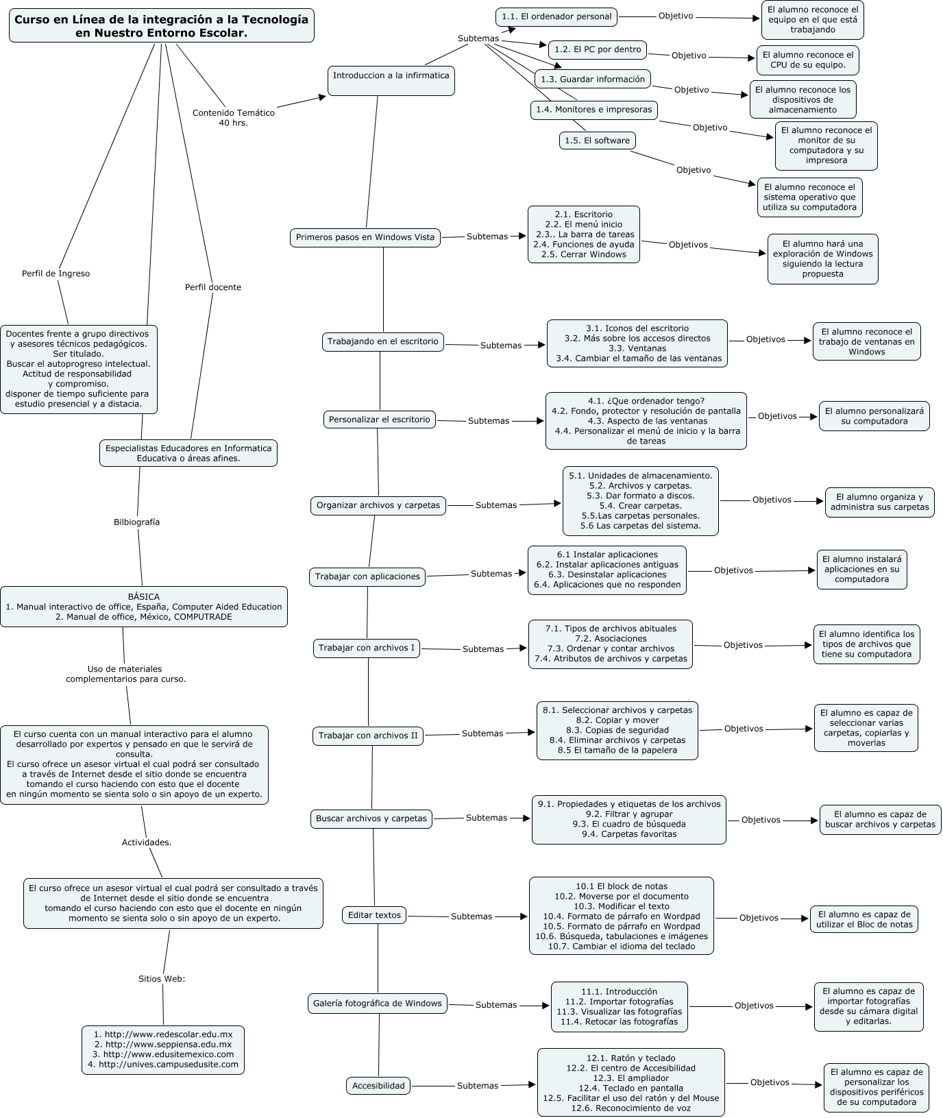 Este Cmap, tiene información relacionada con: Actividad U6, Trabajar con aplicaciones ???? Trabajar con archivos I, 1.5. El software Objetivo El alumno reconoce el sistema operativo que utiliza su computadora, 2.1. Escritorio 2.2. El menú inicio 2.3.. La barra de tareas 2.4. Funciones de ayuda 2.5. Cerrar Windows Objetivos El alumno hará una exploración de Windows siguiendo la lectura propuesta, ???? Uso de materiales complementarios para curso. El curso cuenta con un manual interactivo para el alumno desarrollado por expertos y pensado en que le servirá de consulta. El curso ofrece un asesor virtual el cual podrá ser consultado a través de Internet desde el sitio donde se encuentra tomando el curso haciendo con esto que el docente en ningún momento se sienta solo o sin apoyo de un experto., Trabajar con archivos I Subtemas 7.1. Tipos de archivos abituales 7.2. Asociaciones 7.3. Ordenar y contar archivos 7.4. Atributos de archivos y carpetas, Introduccion a la infirmatica Subtemas 1.2. El PC por dentro, 1.4. Monitores e impresoras Objetivo El alumno reconoce el monitor de su computadora y su impresora, 6.1 Instalar aplicaciones 6.2. Instalar aplicaciones antiguas 6.3. Desinstalar aplicaciones 6.4. Aplicaciones que no responden Objetivos El alumno instalará aplicaciones en su computadora, Trabajar con archivos I ???? Trabajar con archivos II, Personalizar el escritorio Subtemas 4.1. ¿Que ordenador tengo? 4.2. Fondo, protector y resolución de pantalla 4.3. Aspecto de las ventanas 4.4. Personalizar el menú de inicio y la barra de tareas, Introduccion a la infirmatica ???? Primeros pasos en Windows Vista, 12.1. Ratón y teclado 12.2. El centro de Accesibilidad 12.3. El ampliador 12.4. Teclado en pantalla 12.5. Facilitar el uso del ratón y del Mouse 12.6. Reconocimiento de voz Objetivos El alumno es capaz de personalizar los dispositivos periféricos de su computadora, El curso cuenta con un manual interactivo para el alumno desarrollado por expertos y pensado en que le servirá de consulta. El curso ofrece un asesor virtual el cual podrá ser consultado a través de Internet desde el sitio donde se encuentra tomando el curso haciendo con esto que el docente en ningún momento se sienta solo o sin apoyo de un experto. Actividades. El curso ofrece un asesor virtual el cual podrá ser consultado a través de Internet desde el sitio donde se encuentra tomando el curso haciendo con esto que el docente en ningún momento se sienta solo o sin apoyo de un experto., El curso ofrece un asesor virtual el cual podrá ser consultado a través de Internet desde el sitio donde se encuentra tomando el curso haciendo con esto que el docente en ningún momento se sienta solo o sin apoyo de un experto. Sitios Web: 1. http://www.redescolar.edu.mx 2. http://www.seppiensa.edu.mx 3. http://www.edusitemexico.com 4. http://unives.campusedusite.com, Curso en Línea de la integración a la Tecnología en Nuestro Entorno Escolar. Perfil de Ingreso Docentes frente a grupo directivos y asesores técnicos pedagógicos. Ser titulado. Buscar el autoprogreso intelectual. Actitud de responsabilidad y compromiso. disponer de tiempo suficiente para estudio presencial y a distacia., 4.1. ¿Que ordenador tengo? 4.2. Fondo, protector y resolución de pantalla 4.3. Aspecto de las ventanas 4.4. Personalizar el menú de inicio y la barra de tareas Objetivos El alumno personalizará su computadora, Buscar archivos y carpetas ???? Editar textos, Trabajando en el escritorio Subtemas 3.1. Iconos del escritorio 3.2. Más sobre los accesos directos 3.3. Ventanas 3.4. Cambiar el tamaño de las ventanas, 5.1. Unidades de almacenamiento. 5.2. Archivos y carpetas. 5.3. Dar formato a discos. 5.4. Crear carpetas. 5.5.Las carpetas personales. 5.6 Las carpetas del sistema. Objetivos El alumno organiza y administra sus carpetas, Trabajando en el escritorio ???? Personalizar el escritorio